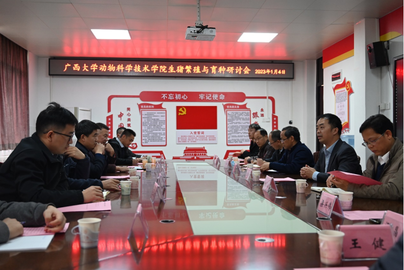 2023年1月4日,新年伊始,在動科院302會議室舉辦了“2022生物資源保護與利用國際產(chǎn)學(xué)研用合作會議”的主題研討會“生豬繁殖與育種研討會”。參加研討會人員有動科院領(lǐng)導(dǎo)陸陽清常務(wù)副院長、何家康副院長、韋祖樟副院長及骨干教師,河南守望之境科技有限公司創(chuàng)始人劉洪波博士,區(qū)內(nèi)養(yǎng)豬企業(yè)育種主要負(fù)責(zé)人趙云翔、司景磊、何昭友等,大家圍繞生豬繁殖與育種主題,分別從繁殖育種、飼料營養(yǎng)、疫病防控、生產(chǎn)管理角度展開了熱烈討論。