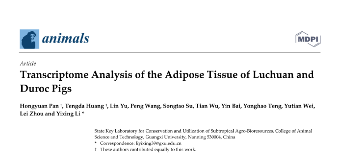 近日,動物科學(xué)技術(shù)學(xué)院動物科學(xué)專業(yè)2019級本科生潘鴻遠(yuǎn)在SCI期刊《animals》 (JCR一區(qū),中國科學(xué)院二區(qū))以第一作者發(fā)表題為“Transcriptome Analysis of the Adipose Tissue of Luchuan and Duroc Pigs”的研究論文。該論文通訊作者為動物科學(xué)技術(shù)學(xué)院李一星副研究員,作者還包括白銀、滕永昊、韋宇天等動物科學(xué)專業(yè)本科生。該研究受到自治區(qū)大學(xué)生創(chuàng)新創(chuàng)業(yè)訓(xùn)練項(xiàng)目以及廣西大學(xué)大創(chuàng)項(xiàng)目倍增計(jì)劃重點(diǎn)項(xiàng)目的支持。