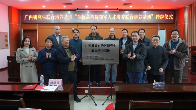 本次活動(dòng)還舉行了廣西研究生聯(lián)合培養(yǎng)基地“畜牧高科技領(lǐng)軍人才培養(yǎng)研究生聯(lián)合培養(yǎng)基地”掛牌儀式。該聯(lián)合培養(yǎng)基地由廣西大學(xué)牽頭,廣西壯族自治區(qū)畜牧研究所和中國(guó)農(nóng)業(yè)科學(xué)院深圳基因組研究所作為合作單位,三方共同合作建設(shè),針對(duì)廣西現(xiàn)有的經(jīng)濟(jì)特點(diǎn)和區(qū)位優(yōu)勢(shì),做好對(duì)研究生的培養(yǎng)工作,為廣西的畜牧業(yè)發(fā)展建設(shè)培養(yǎng)高科技領(lǐng)軍人才,引領(lǐng)畜牧業(yè)發(fā)展。掛牌儀式后雙方專家就廣西畜牧業(yè)發(fā)展和人才隊(duì)伍建設(shè)進(jìn)行了座談交流。陸陽(yáng)清教授首先就廣西大學(xué)動(dòng)物科學(xué)技術(shù)學(xué)院的人才培養(yǎng)優(yōu)勢(shì)和項(xiàng)目資源做了相關(guān)介紹,廣西畜牧研究所所長(zhǎng)吳柱月研究員也介紹了廣西畜牧研究所的基本情況。雙方就利用好優(yōu)勢(shì)資源,充分發(fā)揮畜牧高科技領(lǐng)軍人才培養(yǎng)研究生聯(lián)合培養(yǎng)基地的作用,實(shí)現(xiàn)共贏發(fā)展,同時(shí)為自治區(qū)經(jīng)濟(jì)發(fā)展貢獻(xiàn)力量,助力國(guó)家鄉(xiāng)村振興。