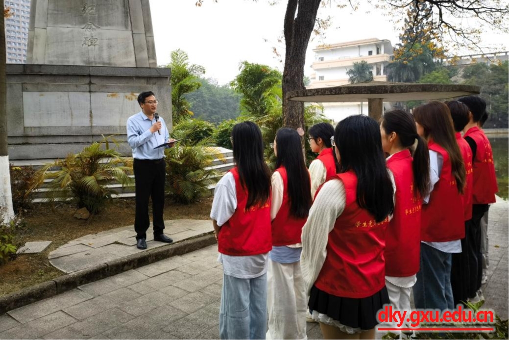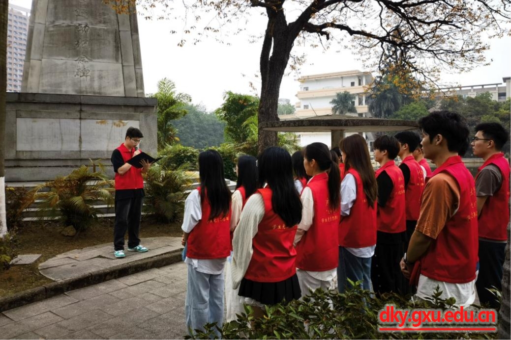 清明憶英烈,豐碑勵(lì)青春。4月11日上午,廣西大學(xué)動(dòng)物科學(xué)技術(shù)學(xué)院組織學(xué)生骨干在碧云湖畔的學(xué)生愛國(guó)民主運(yùn)動(dòng)紀(jì)念碑開展“仰思先輩志,俯繪紀(jì)念碑”主題活動(dòng),引導(dǎo)青年學(xué)子在追思與銘記中堅(jiān)定理想信念,在傳承與創(chuàng)新中涵養(yǎng)家國(guó)情懷。