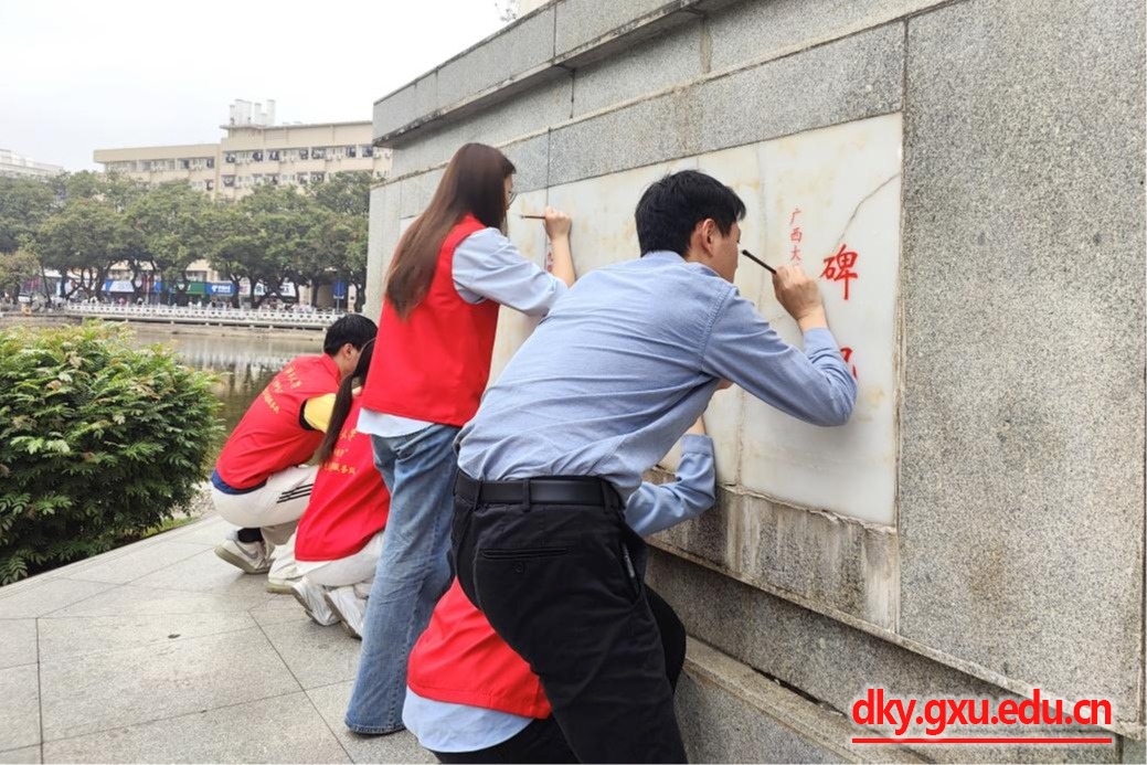 經(jīng)過時(shí)間沉淀和風(fēng)雨剝蝕,紀(jì)念碑的碑文已逐漸褪色。師生們懷著敬仰之情仔細(xì)擦拭碑體上的微塵,認(rèn)真用畫筆為碑文描摹填漆。描紅一筆,更多一分懷念;描紅一畫,更增一分敬意。“為紀(jì)念碑文‘描紅’,給英雄事跡‘上色’,是一份紀(jì)念,一份傳承,更是一次精神洗禮。”畜牧專業(yè)2024級(jí)碩士生梁雯靜同學(xué)說道。