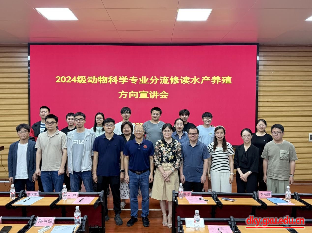 為做好水產(chǎn)養(yǎng)殖方向開設(shè)工作,5月16日下午,廣西大學(xué)動(dòng)物科學(xué)技術(shù)學(xué)院在學(xué)院318報(bào)告廳舉辦動(dòng)物科學(xué)專業(yè)分流修讀水產(chǎn)養(yǎng)殖方向宣講會(huì),特別邀請(qǐng)北部灣大學(xué)朱鵬教授和南寧海大公司水產(chǎn)線黃榮峻經(jīng)理2位校友為同學(xué)們講解水產(chǎn)行業(yè)的發(fā)展概況、前景和優(yōu)勢等。動(dòng)物科學(xué)技術(shù)學(xué)院副院長韋祖樟,動(dòng)物科學(xué)系副主任黃潔萍,水產(chǎn)學(xué)科教師潘英、李文紅、歐偉豪、吳麗娜、陸寶悅、張建鵬、李琦,輔導(dǎo)員李麗娜,以及全體2024級(jí)動(dòng)物科學(xué)專業(yè)本科生、水產(chǎn)全體研究生參加活動(dòng)。會(huì)議由黃潔萍副主任主持。