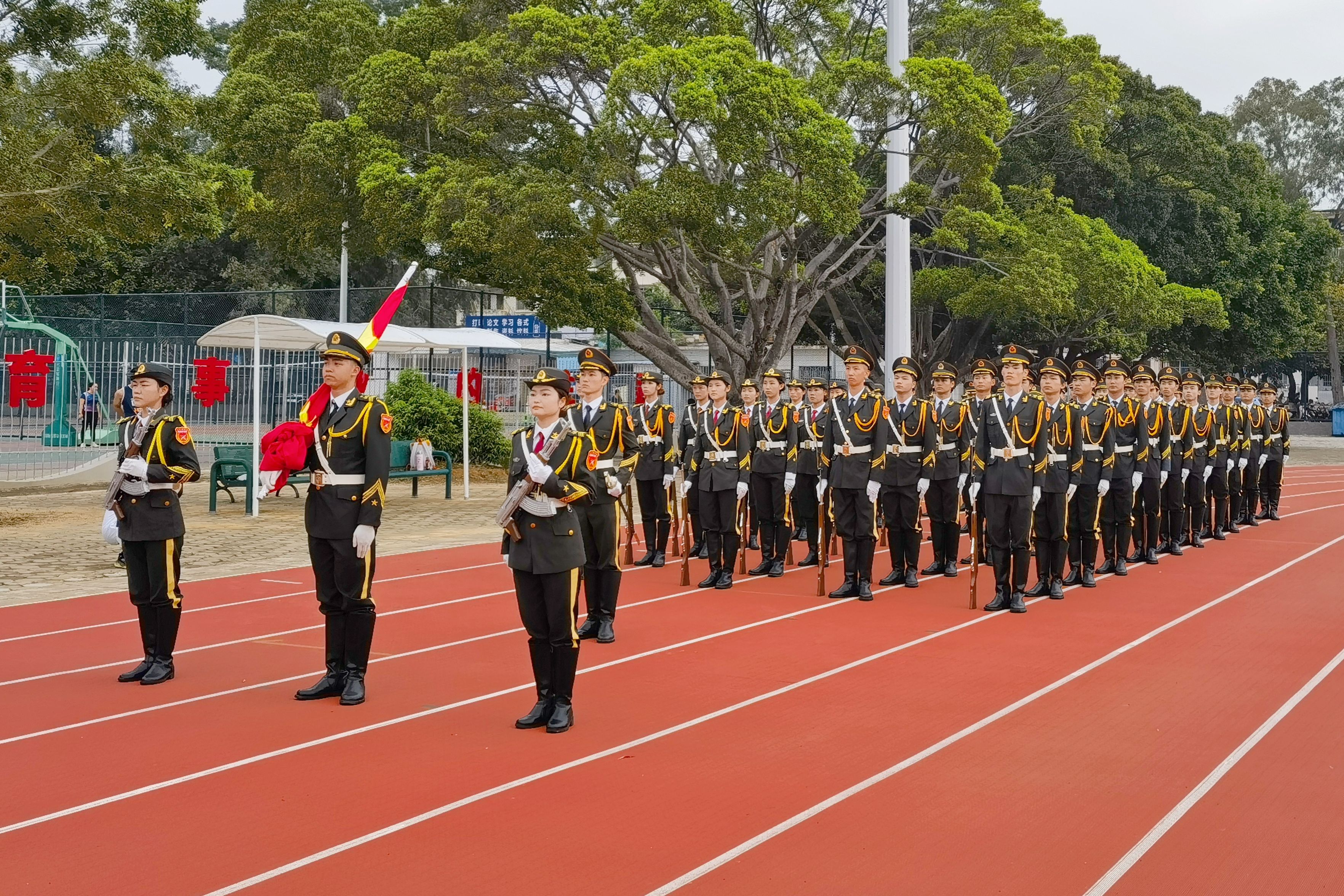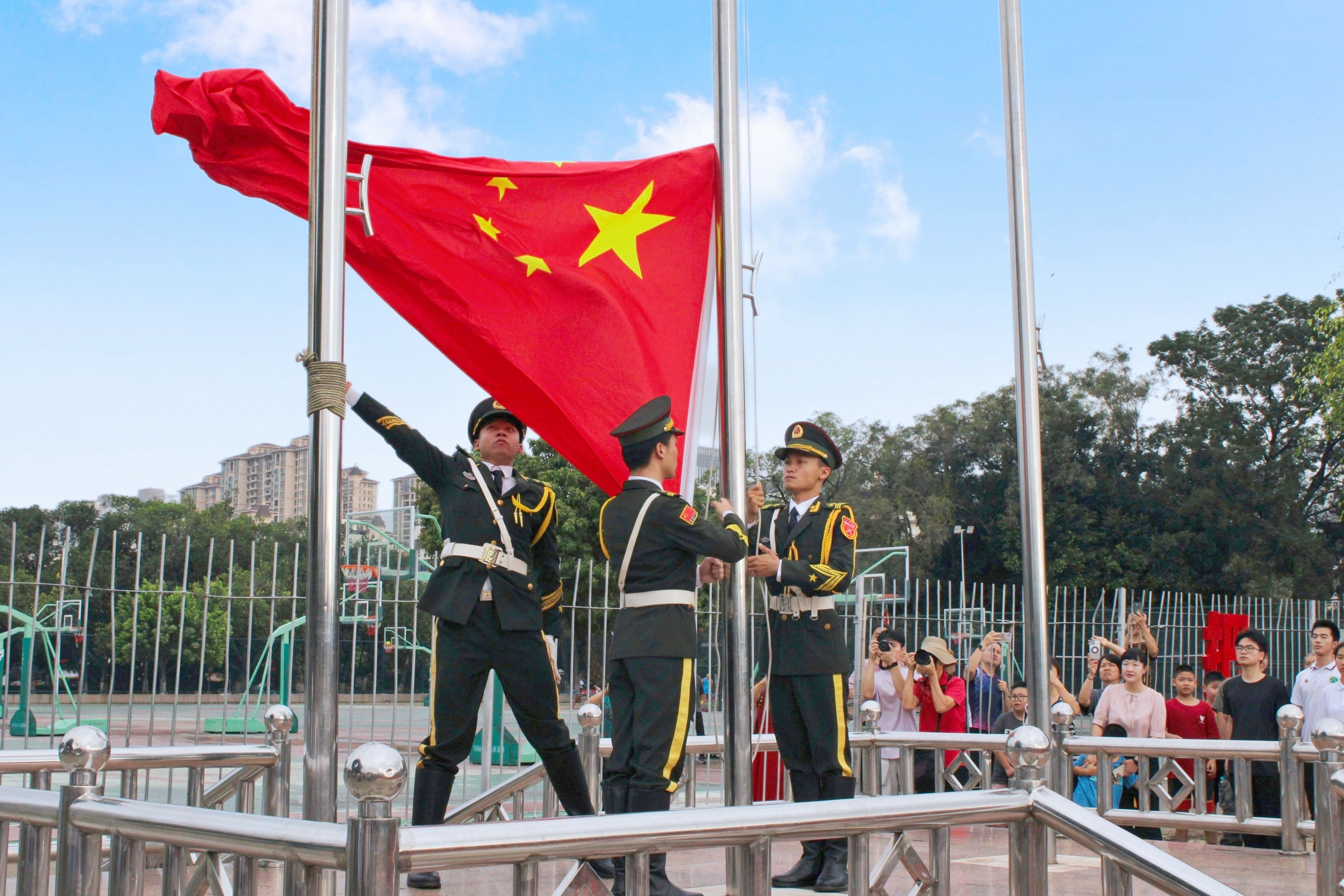 在全場師生的注目下,英姿颯爽的國旗護衛(wèi)隊隊員,邁著整齊劃一、鏗鏘有力的步伐,護送鮮艷的五星紅旗進(jìn)場。“起來,不愿做奴隸的人們,把我們的血肉,筑成我們新的長城……”全場師生精神抖擻、莊嚴(yán)肅穆,齊聲高唱國歌,注視著鮮艷的五星紅旗冉冉升起。
