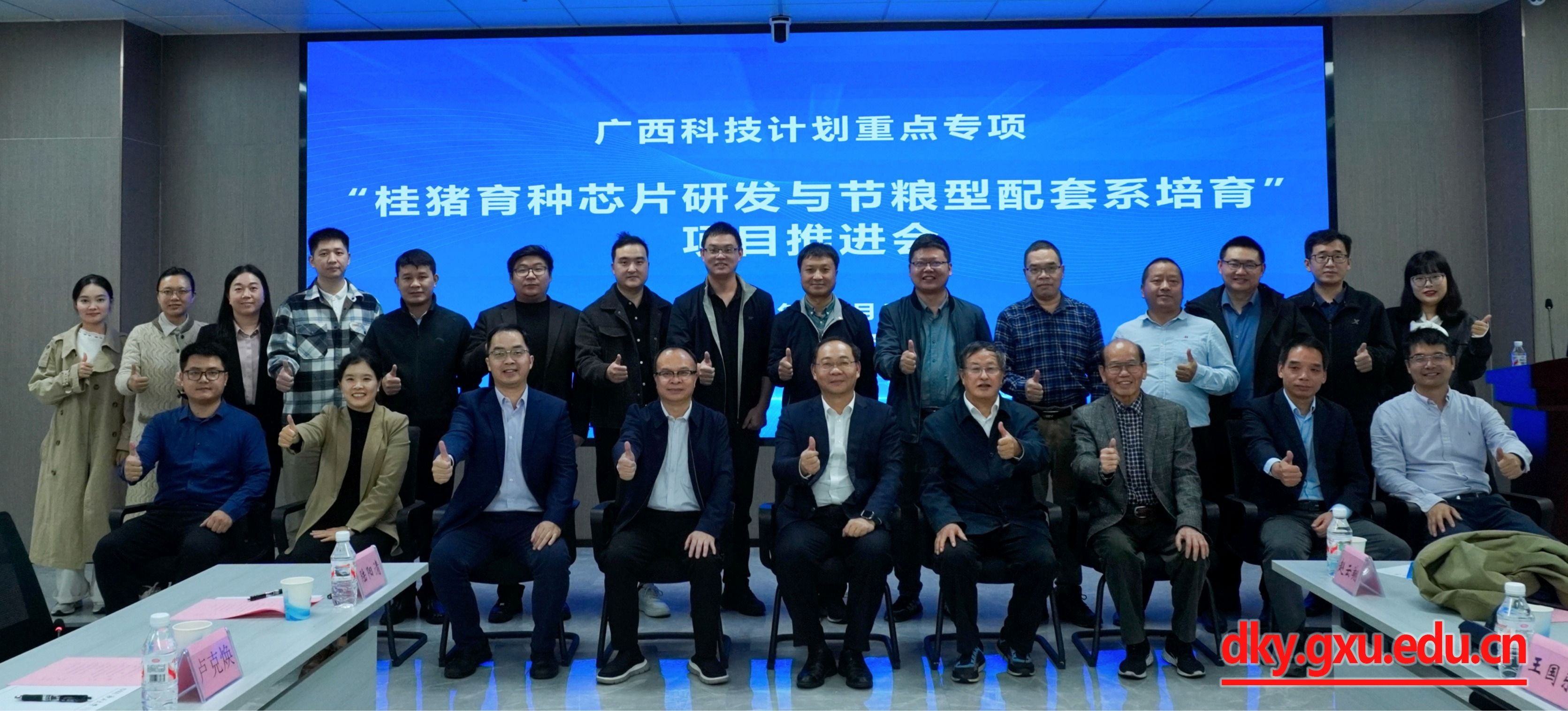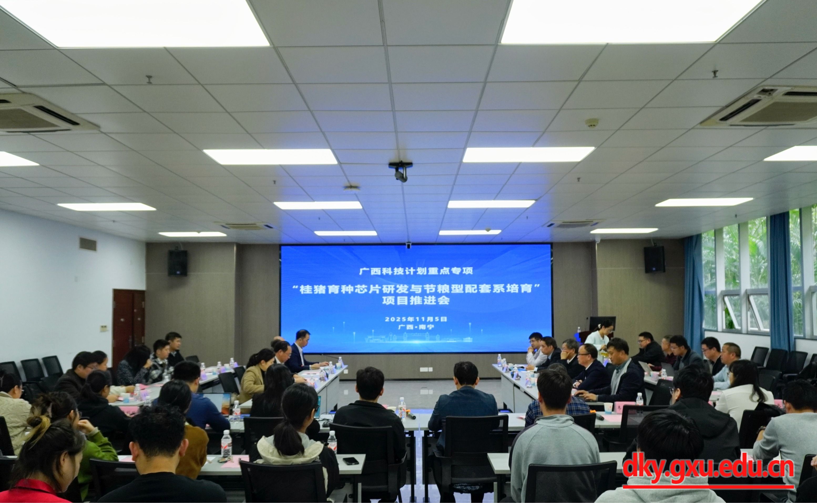 11月5日,我校召開廣西科技計劃重點專項“桂豬育種芯片研發(fā)與節(jié)糧型配套系培育”2025年項目推進(jìn)會。中國工程院院士、中國科學(xué)院亞熱帶農(nóng)業(yè)生態(tài)研究所研究員印遇龍,廣西大學(xué)副校長于文進(jìn),自治區(qū)農(nóng)業(yè)農(nóng)村廳科技處副處長王國樂出席會議并致辭。廣西大學(xué)動物科學(xué)技術(shù)學(xué)院院長陸陽清主持開幕式。廣西大學(xué)原副校長盧克煥,自治區(qū)農(nóng)業(yè)農(nóng)村廳農(nóng)墾處一級調(diào)研員盧玉發(fā),廣西大學(xué)科研院項目管理處副處長張敏,廣西大學(xué)動物科學(xué)技術(shù)學(xué)院副院長何家康,廣西大學(xué)動物科學(xué)技術(shù)學(xué)院教授、項目負(fù)責(zé)人趙云翔及來自8家項目參與單位的科研骨干人員參加會議。