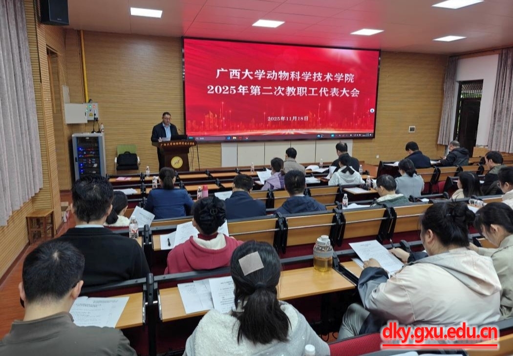 11月18日下午,廣西大學(xué)動(dòng)物科學(xué)技術(shù)學(xué)院2025年第二次教職工代表大會(huì)在學(xué)院318報(bào)告廳召開(kāi)。動(dòng)物科學(xué)技術(shù)學(xué)院黨委書(shū)記韋小強(qiáng),院長(zhǎng)陸陽(yáng)清,副院長(zhǎng)何家康、韋祖樟,學(xué)院教代會(huì)代表參加會(huì)議。動(dòng)物科學(xué)技術(shù)學(xué)院副院長(zhǎng)、分工會(huì)主席郭愛(ài)濤主持會(huì)議。大會(huì)審議并通過(guò)了《動(dòng)物科學(xué)技術(shù)學(xué)院2025年貢獻(xiàn)績(jī)效工資分配方案》《動(dòng)物科學(xué)技術(shù)學(xué)院分工會(huì)2025年會(huì)費(fèi)收支情況報(bào)告》。