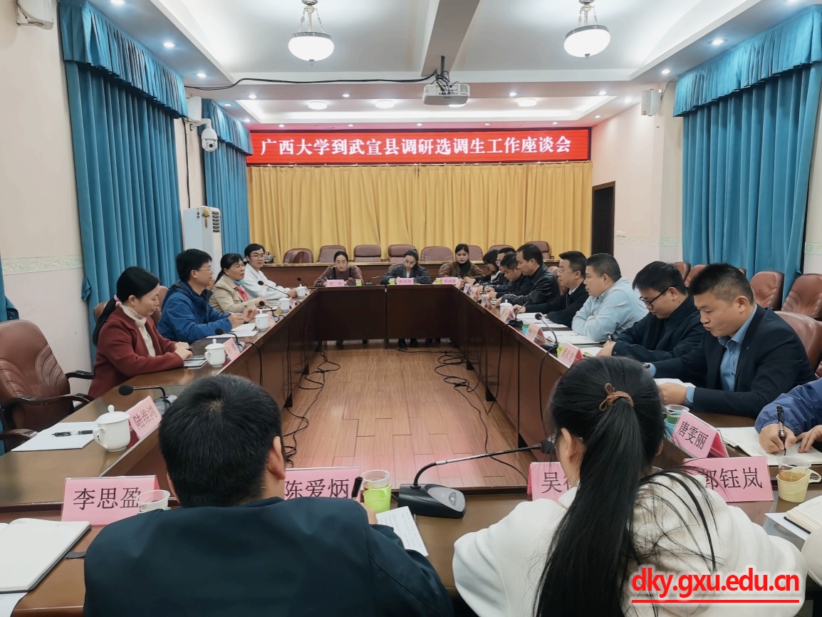 12月4日至5日,廣西大學(xué)動物科學(xué)技術(shù)學(xué)院黨委書記韋小強帶隊赴來賓市武宣縣、興賓區(qū)調(diào)研選調(diào)生工作,并分別與武宣縣委組織部、興賓區(qū)委組織部座談。武宣縣委常委、組織部部長張波,興賓區(qū)委常委、組織部部長藍文鈺以及在兩地工作的廣西大學(xué)選調(diào)生代表參加座談。
