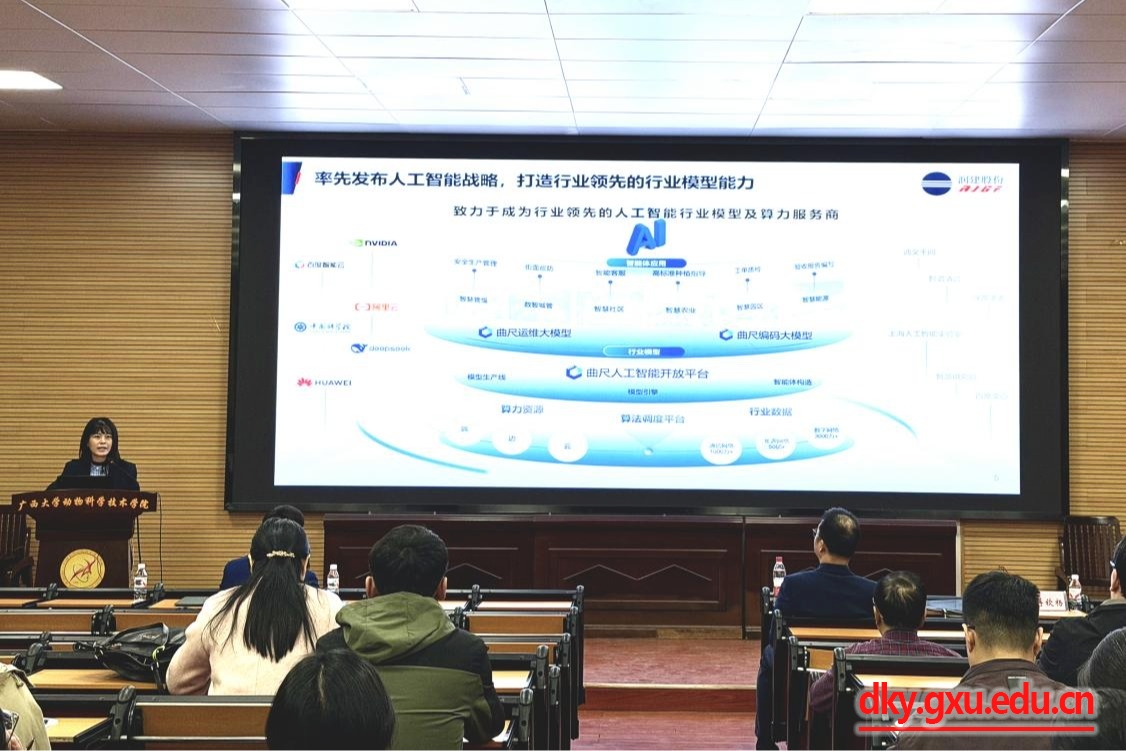 12月24日下午,廣西大學(xué)動(dòng)物科學(xué)技術(shù)學(xué)院在學(xué)院318會(huì)議室舉辦“AI助力高校高質(zhì)量發(fā)展專題”專題報(bào)告會(huì),并與潤建股份有限公司廣西公司負(fù)責(zé)人座談交流。動(dòng)物科學(xué)技術(shù)學(xué)院黨委書記韋小強(qiáng),院長陸陽清,學(xué)院黨委副書記楊雪,副院長蔣欽楊,潤建股份有限公司廣西公司黨總支書記、執(zhí)行主席李群偉,高校AI事業(yè)部總經(jīng)理唐貴明,總經(jīng)理助理、市場銷售部總經(jīng)理黃熒,教育行業(yè)總監(jiān)陳志鵬,以及學(xué)院部分師生代表共同參加活動(dòng)。