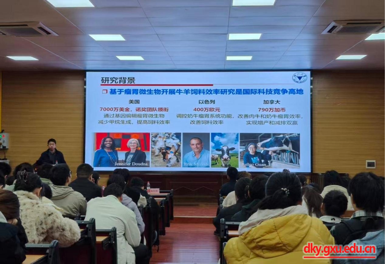 為加強校際學(xué)術(shù)交流與合作,推動科教融合,營造良好的學(xué)術(shù)氛圍。1月7日上午,廣西大學(xué)動物科學(xué)技術(shù)學(xué)院牛羊種業(yè)團隊在318報告廳舉行學(xué)術(shù)報告會。活動以“高通量單細胞和單細菌RNA測序技術(shù)的開發(fā)與應(yīng)用”和“瘤胃微生物組與反芻動物高效生產(chǎn)”為主題,特邀浙江大學(xué)王永成、孫會增研究員作專題學(xué)術(shù)報告。動物科學(xué)技術(shù)學(xué)院院長陸陽清,副院長何家康、蔣欽楊,生命科學(xué)與技術(shù)學(xué)院副院長李偉輝,以及100余名師生代表到場聆聽、問答。活動由蔣欽楊副院長主持。