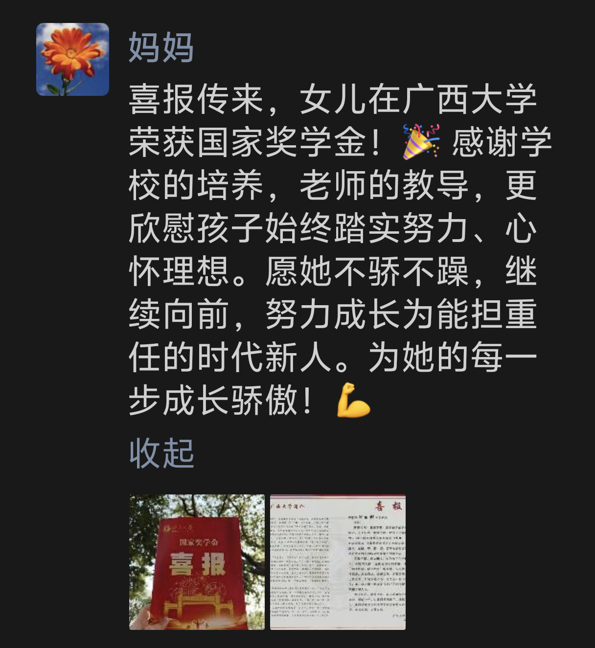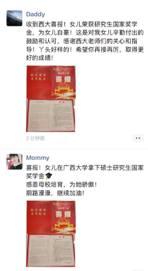 碩士研究生國家獎學金獲獎學生胡靜家長