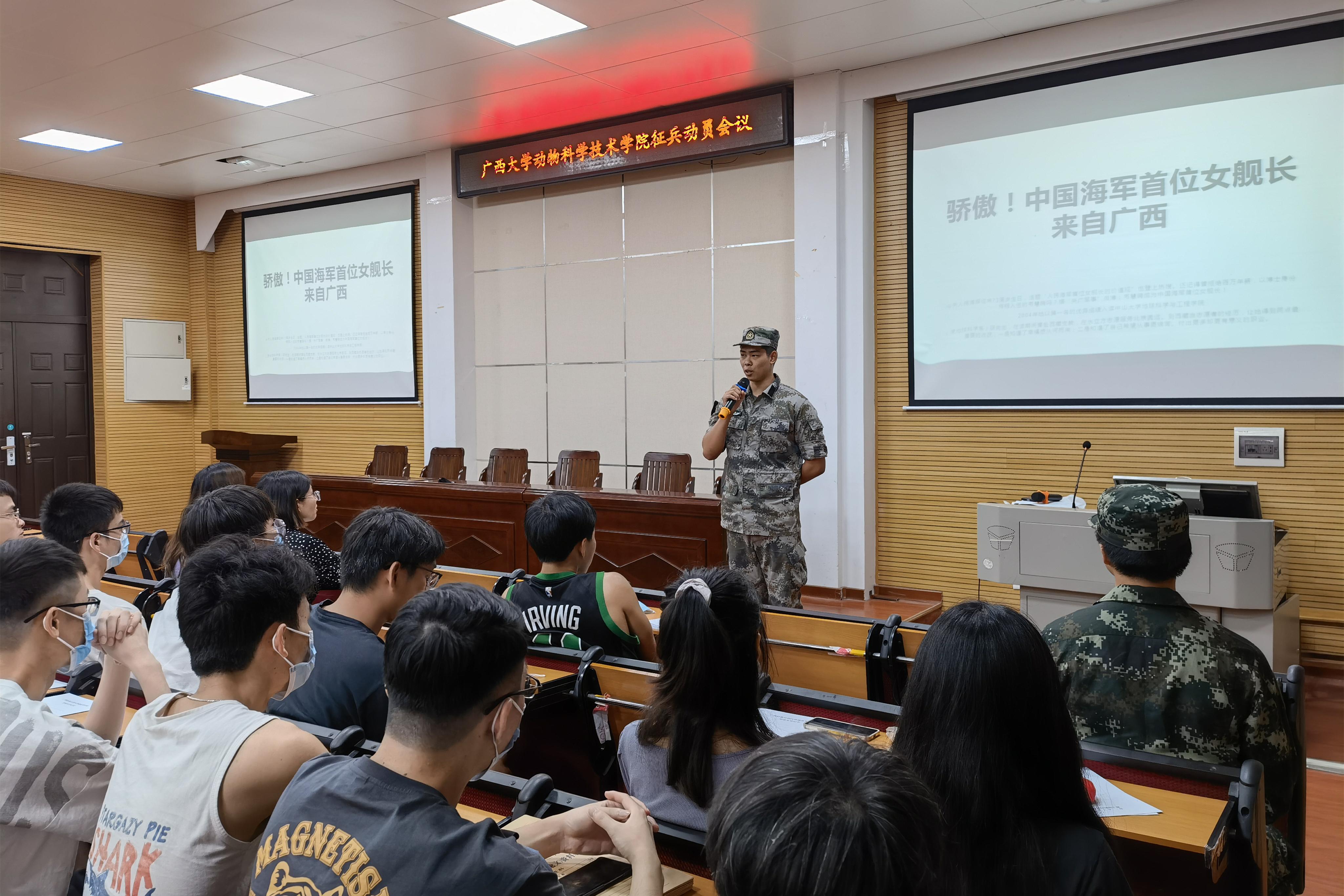 5月20日下午,廣西大學(xué)動(dòng)物科學(xué)技術(shù)學(xué)院在318報(bào)告廳舉行2022年秋季征兵動(dòng)員會(huì)議,校武裝部陳榕平和退伍大學(xué)生代表受邀到場(chǎng)為同學(xué)們?cè)敿?xì)講解征兵政策。動(dòng)物科學(xué)技術(shù)學(xué)院團(tuán)委書(shū)記李麗娜,團(tuán)委副書(shū)記劉誠(chéng),輔導(dǎo)員彭可可和2022屆畢業(yè)本科生參加此次會(huì)議。