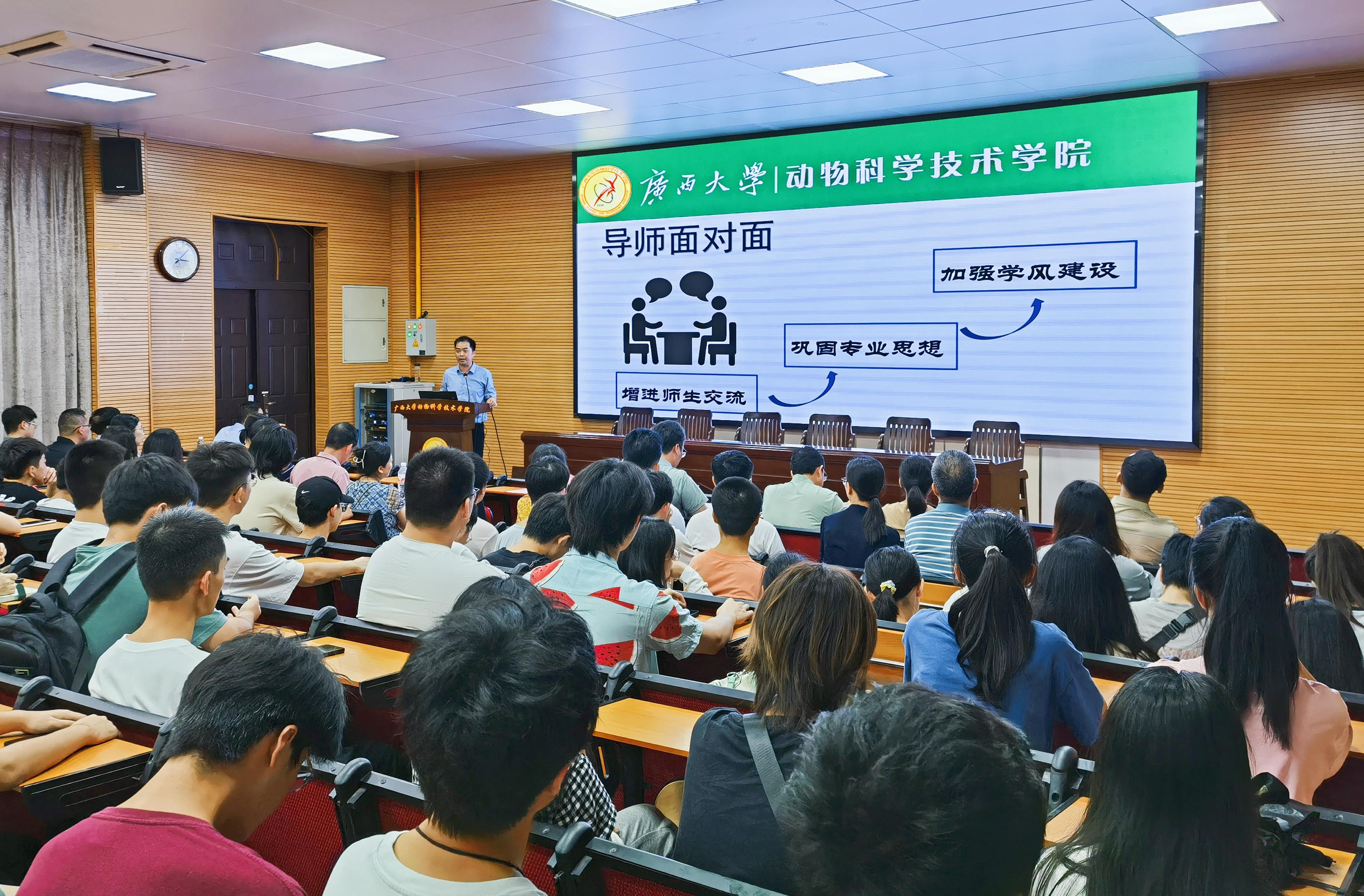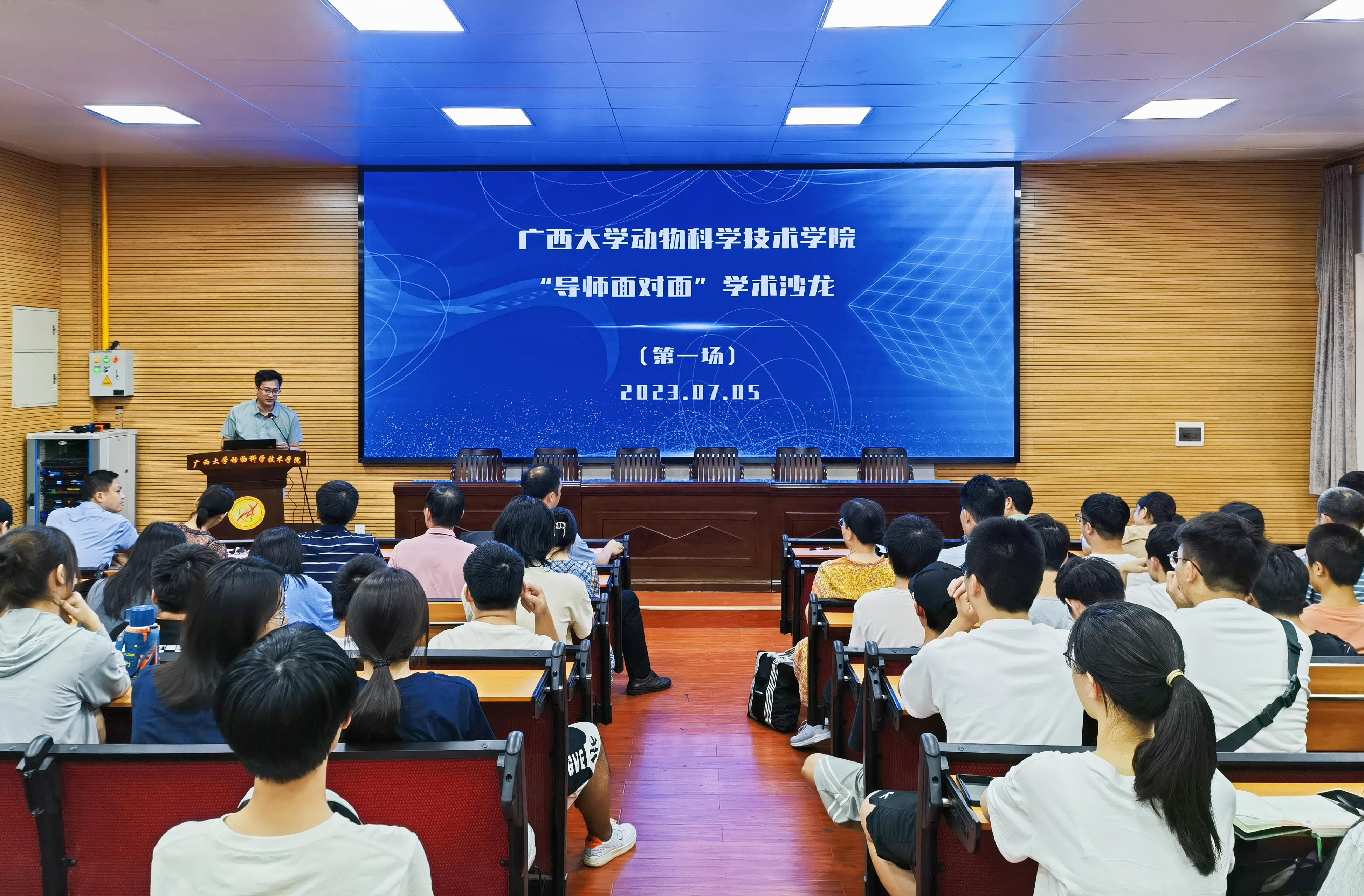 為鞏固專業(yè)思想,加強(qiáng)學(xué)風(fēng)建設(shè),增進(jìn)師生交流,營造學(xué)術(shù)氛圍,7月5日下午,廣西大學(xué)動(dòng)物科學(xué)技術(shù)學(xué)院在學(xué)院318報(bào)告廳舉辦第二季“導(dǎo)師面對(duì)面”學(xué)術(shù)沙龍(第一場),邀請(qǐng)石德順、陸陽清、陸鳳花、蔣欽楊、胡傳活、梁興偉、李一星、潘紅平、林波、黃艷娜、宋子儀、黃潔萍、劉興廷、孔志偉、王健、張瑞門、吳昱果17位導(dǎo)師嘉賓到場分享個(gè)人經(jīng)歷、人才培養(yǎng)和科研方向,并與學(xué)生互動(dòng)交流,共同探討學(xué)業(yè)規(guī)劃、職業(yè)發(fā)展和個(gè)人成長。動(dòng)物科學(xué)專業(yè)2022級(jí)全體本科生參加此次活動(dòng)。