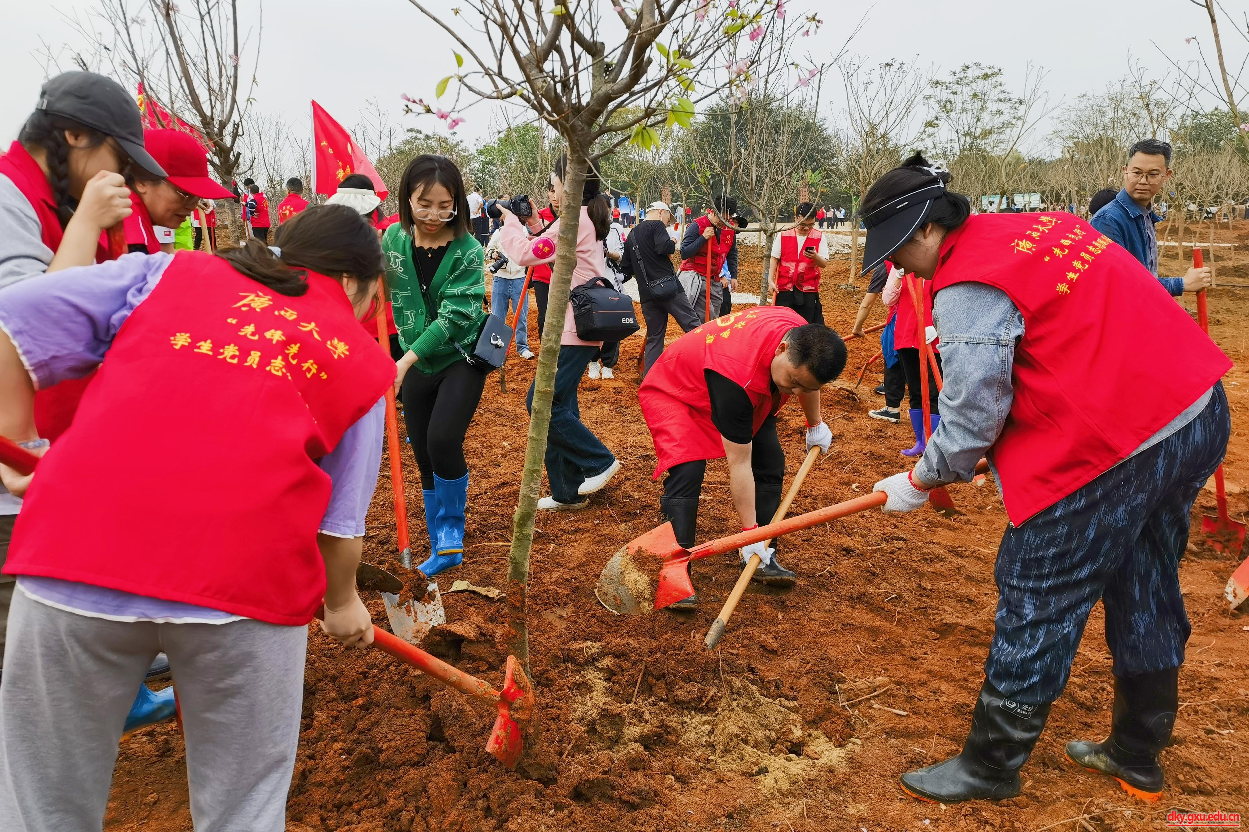 活動現(xiàn)場,600余名青年代表在技術(shù)人員指導下,扶樹正苗、揮鍬鏟土、培土圍堰、提水澆灌,認真細致完成每道植樹工序,齊心協(xié)力種下黃花風鈴木、紫花風鈴木、櫻花樹等花卉苗木1300多株,為美麗廣西再添斑斕色彩。