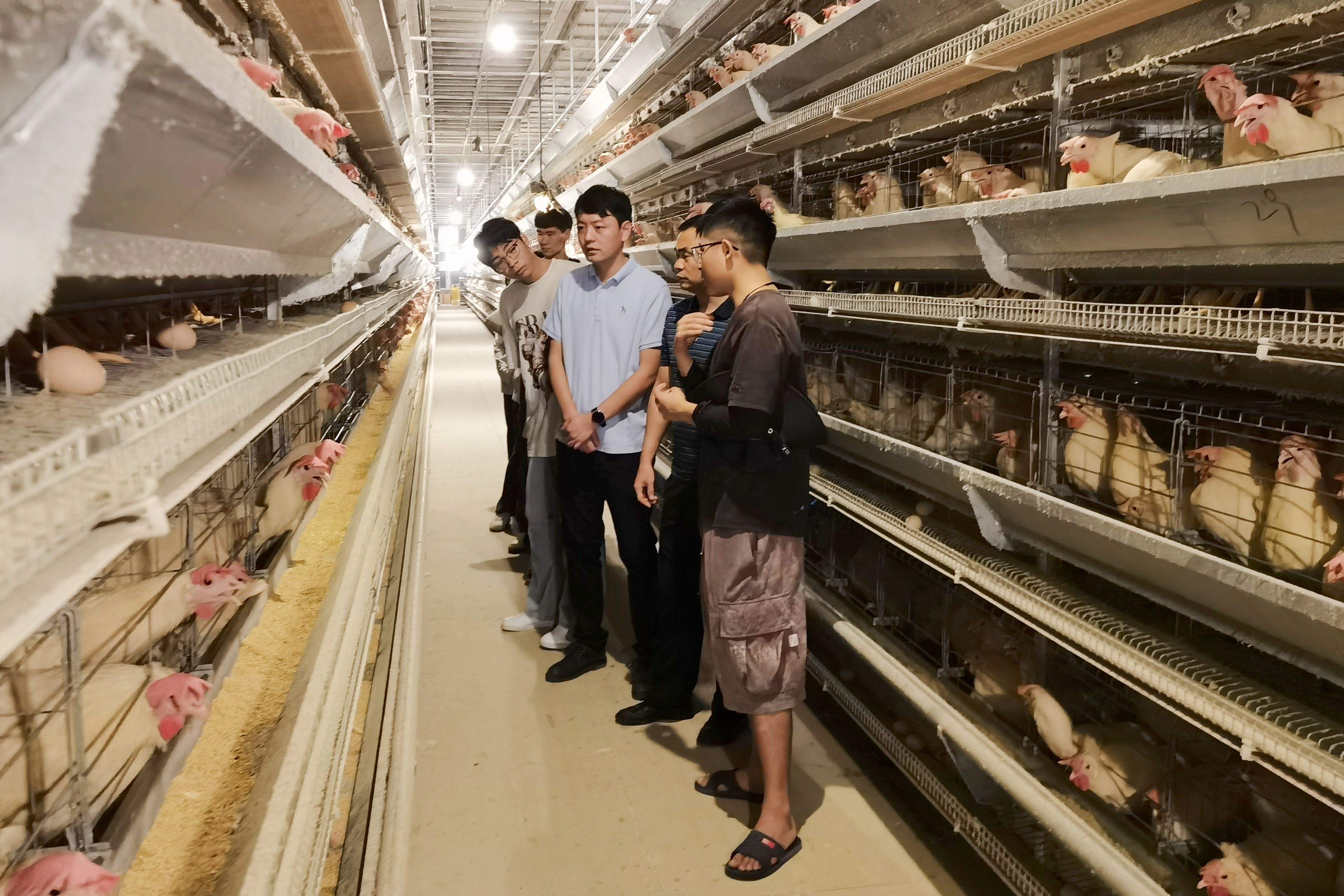 在廣西三江騰竣農(nóng)業(yè)有限公司的沙宜蛋雞養(yǎng)殖示范基地,標(biāo)準(zhǔn)化雞籠排列整齊,其喂料、揀蛋、集糞、光照、控溫等程序全部自動運(yùn)行。實踐團(tuán)師生通過實地參觀全面了解企業(yè)的發(fā)展歷程、業(yè)務(wù)板塊、生態(tài)保護(hù)、粵桂協(xié)作等情況,并與技術(shù)人員詳細(xì)探討蛋雞養(yǎng)殖的關(guān)鍵要素、創(chuàng)新工藝和實踐經(jīng)驗。