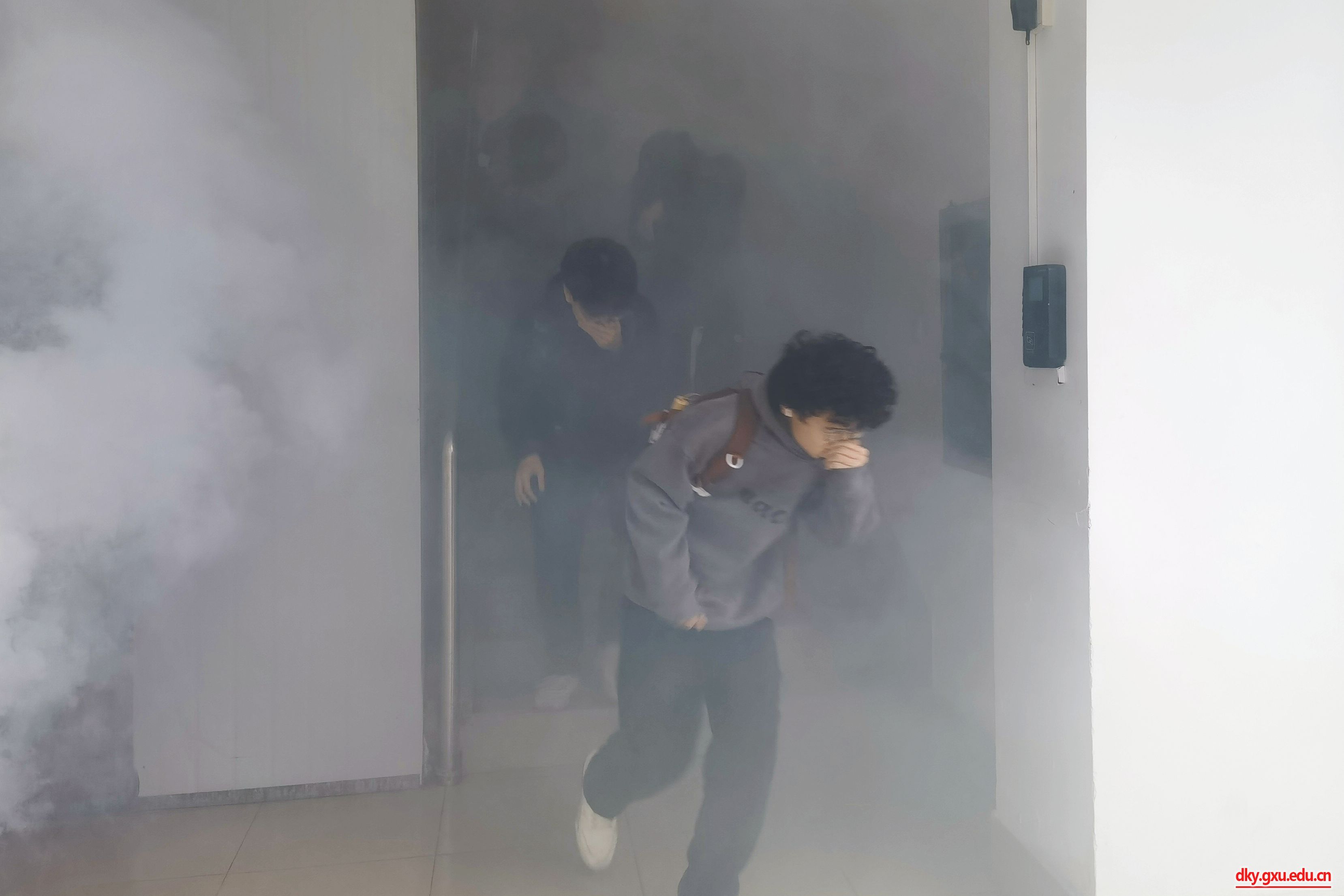 “演練開始!”模擬火場(chǎng)內(nèi)頓時(shí)“濃煙彌漫”,參演學(xué)生紛紛彎腰低身,捂住口鼻,按照規(guī)劃路線,快速、有序地撤離到安全地帶。