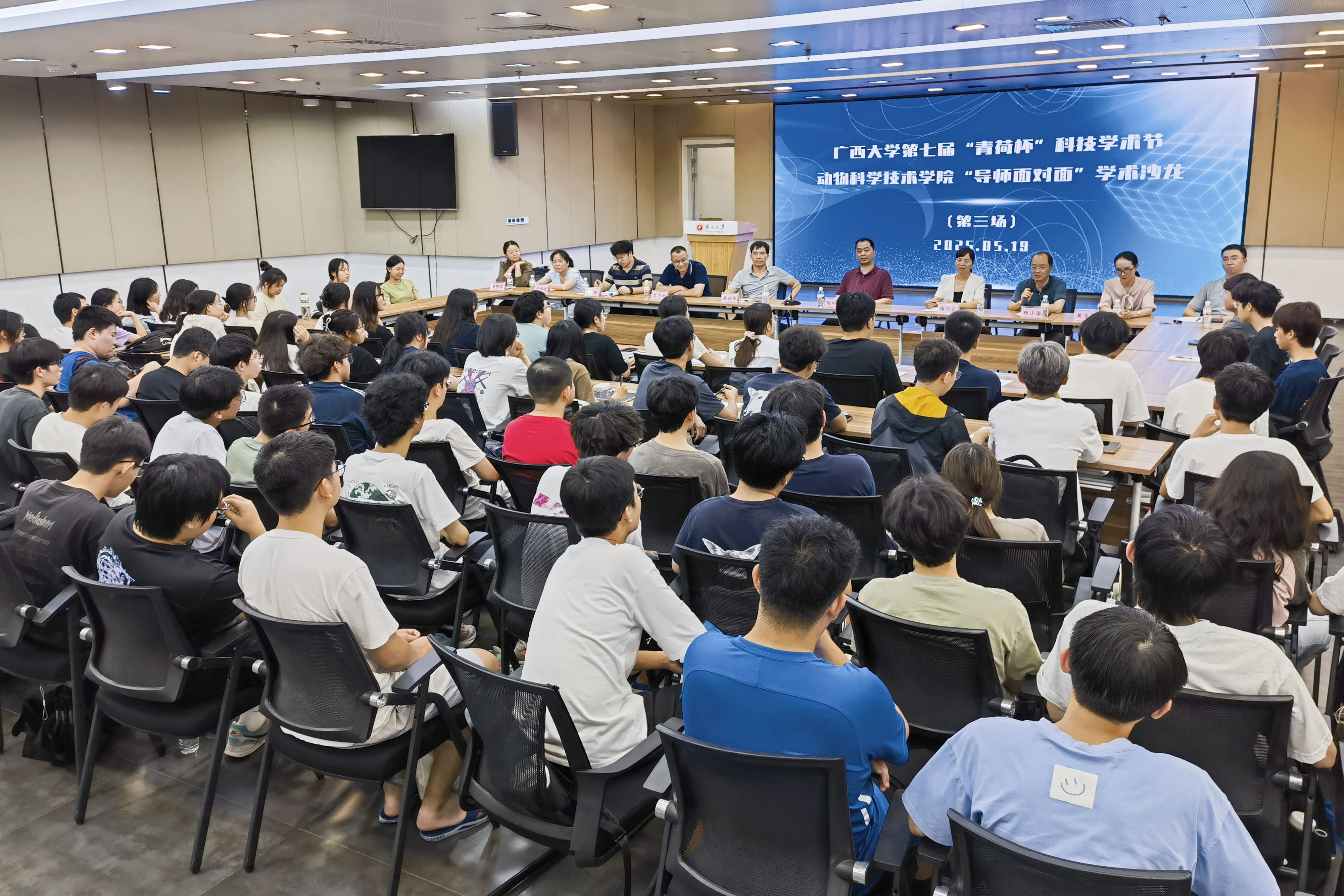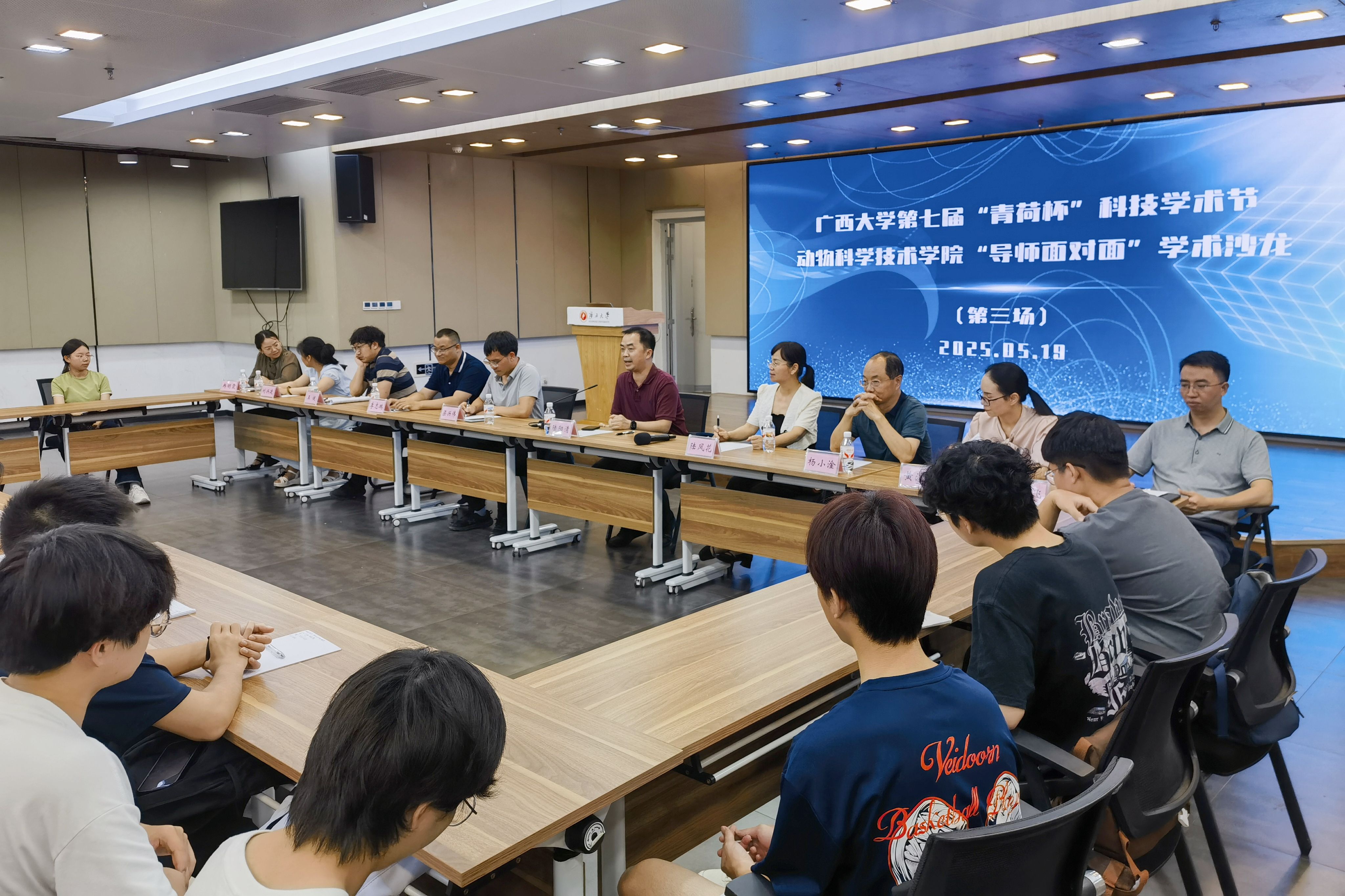 為鞏固專業(yè)思想,加強(qiáng)學(xué)風(fēng)建設(shè),增進(jìn)師生交流,營(yíng)造學(xué)術(shù)氛圍,5月19日晚上,廣西大學(xué)動(dòng)物科學(xué)技術(shù)學(xué)院在大學(xué)生活動(dòng)中心三樓會(huì)議廳舉辦第三季“導(dǎo)師面對(duì)面”學(xué)術(shù)沙龍(第三場(chǎng)),邀請(qǐng)陸陽清、陸鳳花、鄧彥飛、楊小淦、梁興偉、黃潔萍、李志鵬、劉興廷、王健、冉明霞10位導(dǎo)師嘉賓到場(chǎng)分享個(gè)人經(jīng)歷、人才培養(yǎng)和科研方向,并與學(xué)生互動(dòng)交流,共同探討學(xué)業(yè)規(guī)劃、職業(yè)發(fā)展和個(gè)人成長(zhǎng)。動(dòng)物科學(xué)專業(yè)2024級(jí)全體本科生參加此次活動(dòng)。