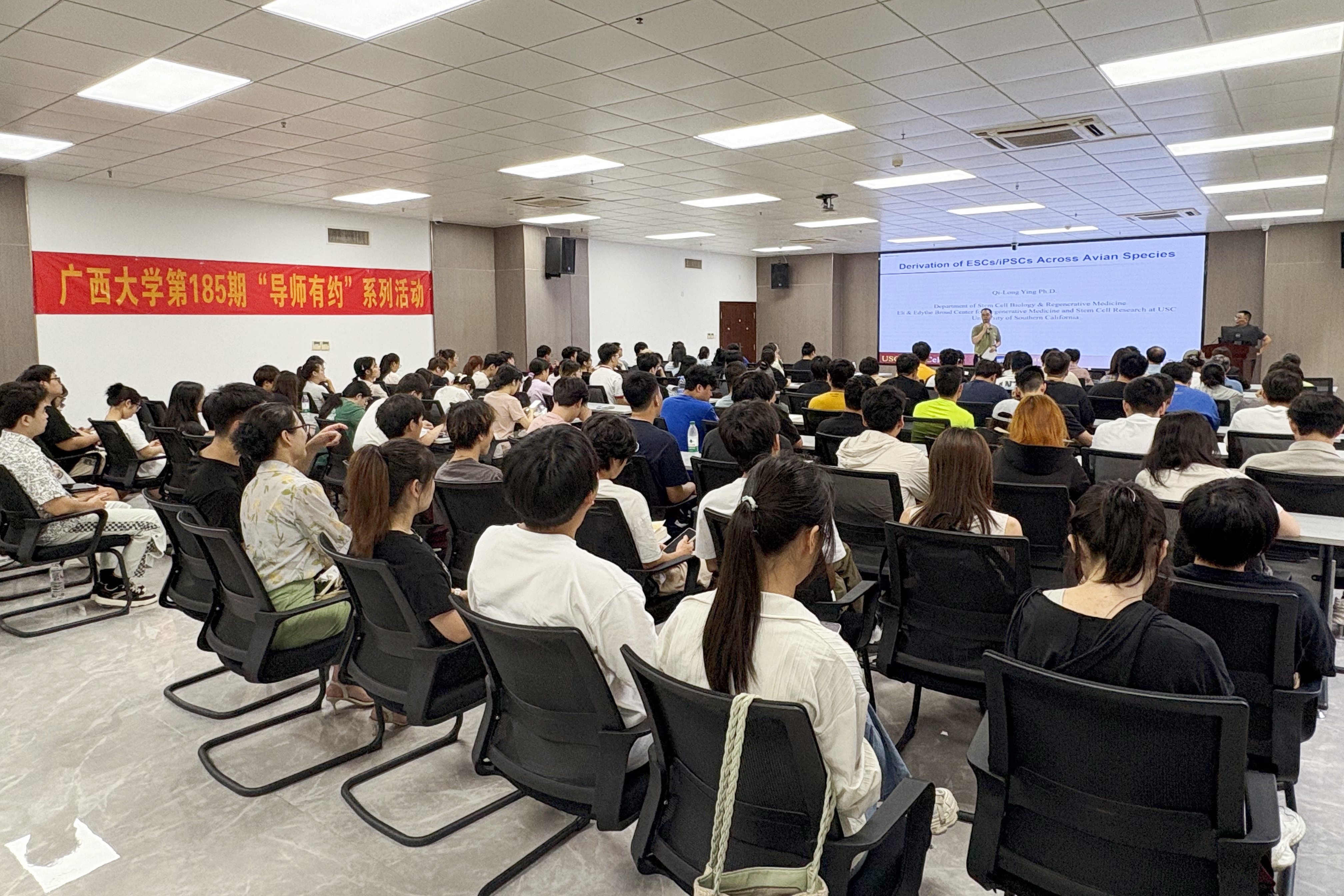 為搭建研究生與導(dǎo)師之間的互動(dòng)平臺(tái),營(yíng)造良好的學(xué)術(shù)文化交流氛圍,6月17日下午,由廣西大學(xué)研究生會(huì)主辦,動(dòng)物科學(xué)技術(shù)學(xué)院研究生會(huì)承辦的第185期“導(dǎo)師有約”活動(dòng)在國(guó)家重點(diǎn)實(shí)驗(yàn)室107會(huì)議室舉行,主題為“不同禽類物種誘導(dǎo)多能干細(xì)胞(iPSCs)和胚胎干細(xì)胞(ESCs)的獲取方法研究”,美國(guó)南加州大學(xué)干細(xì)胞及再生醫(yī)學(xué)研究中心終身教授應(yīng)其龍受邀主講,200余名研究生代表現(xiàn)場(chǎng)聆聽報(bào)告。活動(dòng)由動(dòng)物科學(xué)技術(shù)學(xué)院院長(zhǎng)陸陽(yáng)清主持。