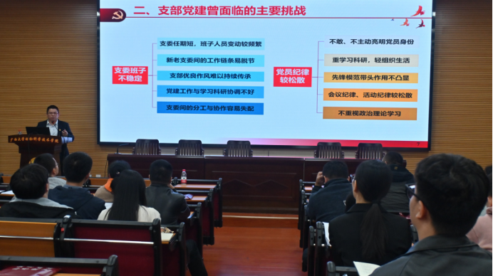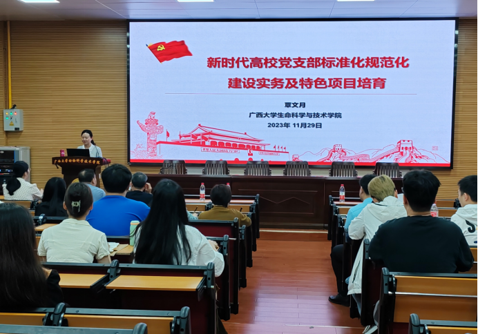 廣西大學生命科學與技術學院黨委副書記覃文月,廣西大學文學院黨委委員、專職組織員楊雪圍繞黨支部標準化規(guī)范化建設要求、發(fā)展黨員程序及要求分別做了專題培訓。