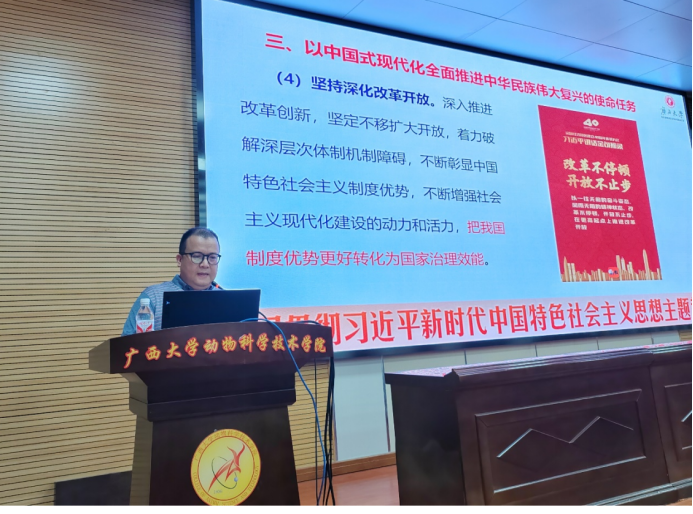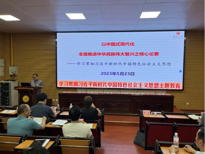 為深入開展學(xué)習(xí)貫徹習(xí)近平新時代中國特色社會主義思想,5月23日下午,我院邀請廣西大學(xué)馬克思主義學(xué)院馬克思主義中國化方向負(fù)責(zé)人楊勇教授為我院師生講授《以中國式現(xiàn)代化全面推進(jìn)中華民族偉大復(fù)興之核心論要——學(xué)習(xí)貫徹習(xí)近平新時代中國特色社會主義思想》專題黨課。