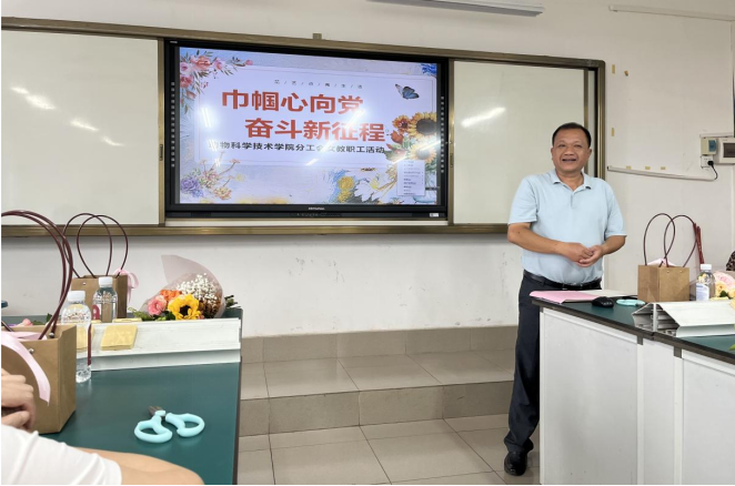 為深入學(xué)習(xí)宣傳貫徹習(xí)近平新時(shí)代中國特色社會(huì)主義思想,營造積極向上、團(tuán)結(jié)友愛的氛圍,豐富教工文化生活,7月4日下午,廣西大學(xué)動(dòng)物科學(xué)技術(shù)學(xué)院分工會(huì)組織女教職工在學(xué)院B404室開展“巾幗心向黨 奮進(jìn)新征程”主題插花活動(dòng)。動(dòng)物科學(xué)技術(shù)學(xué)院黨委書記顧慕嫻,動(dòng)物科學(xué)技術(shù)學(xué)院分工會(huì)主席寧鵬飛參加了本次活動(dòng)。