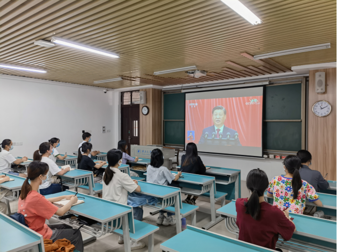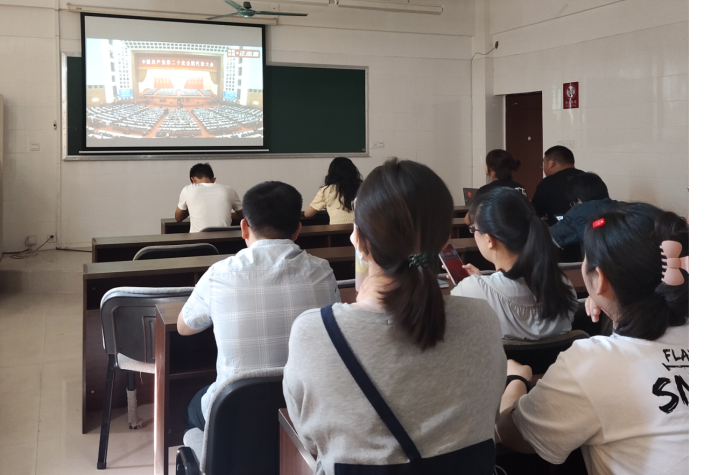 我院黨委組織學(xué)院領(lǐng)導(dǎo)班子成員、理論學(xué)習(xí)中心組成員、各黨支部書記、各黨支部委員和部分師生黨員代表在學(xué)院318會(huì)議室集中收看了本次大會(huì)實(shí)時(shí)直播,師生們端坐在大屏幕前,聚精會(huì)神觀看。