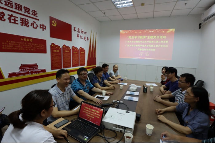下午5:00,廣西大學動科院教工第二、六黨支部來到廣西悅牧生物公司廣西獸醫(yī)社會化服務(wù)示范點,與廣西獸醫(yī)協(xié)會黨支部聯(lián)合開展“黨史學習教育”主題黨日活動。首先是劉紅云博士介紹廣西獸醫(yī)社會化服務(wù)基本情況,并就社會化服務(wù)中有關(guān)獸醫(yī)專家?guī)炫c支部各位黨員進行深入交流,并熱忱邀請教工第二黨支部黨員發(fā)揮專業(yè)特長,積極報名專家?guī)觳⒓犹岣邚V西獸醫(yī)技能水平各項培訓。接著,顧慕嫻書記給全體黨員同志上了一堂生動翔實的黨課,顧書記指出,脫貧攻堅取得全面勝利是中國共產(chǎn)黨對全國人民作出的莊嚴承諾,具有里程碑式的意義,通過黨史學習教育,培養(yǎng)更多“知農(nóng)、愛農(nóng)”專業(yè)人才,加強院企合作,參與解決行業(yè)發(fā)展面臨的困境,助力提升我區(qū)乃至全國畜牧業(yè)的競爭力。