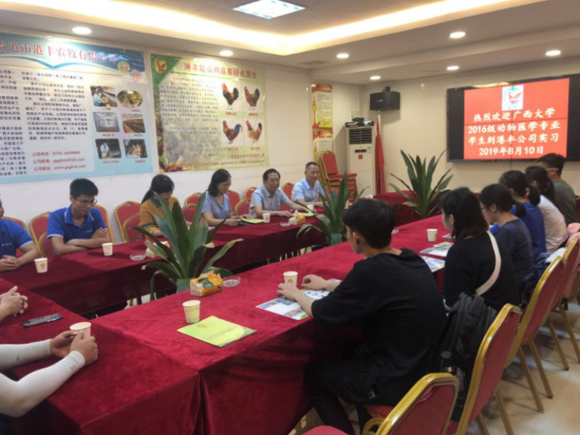 2019年8月10日,支部黨員韋英益和磨美蘭同志帶隊2016級動醫(yī)專業(yè)本科生到貴港港豐公司進行生產(chǎn)實習和技術(shù)指導,與港豐公司領(lǐng)導和養(yǎng)殖場主要負責人進行座談,了解養(yǎng)殖場的養(yǎng)殖情況;磨美蘭同志就雞病傳染性支氣管炎的具體防控提出相關(guān)的建議和意見,并進行臨床樣品采集,協(xié)助公司進行診斷。