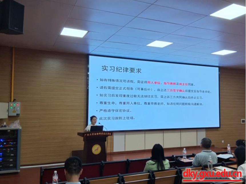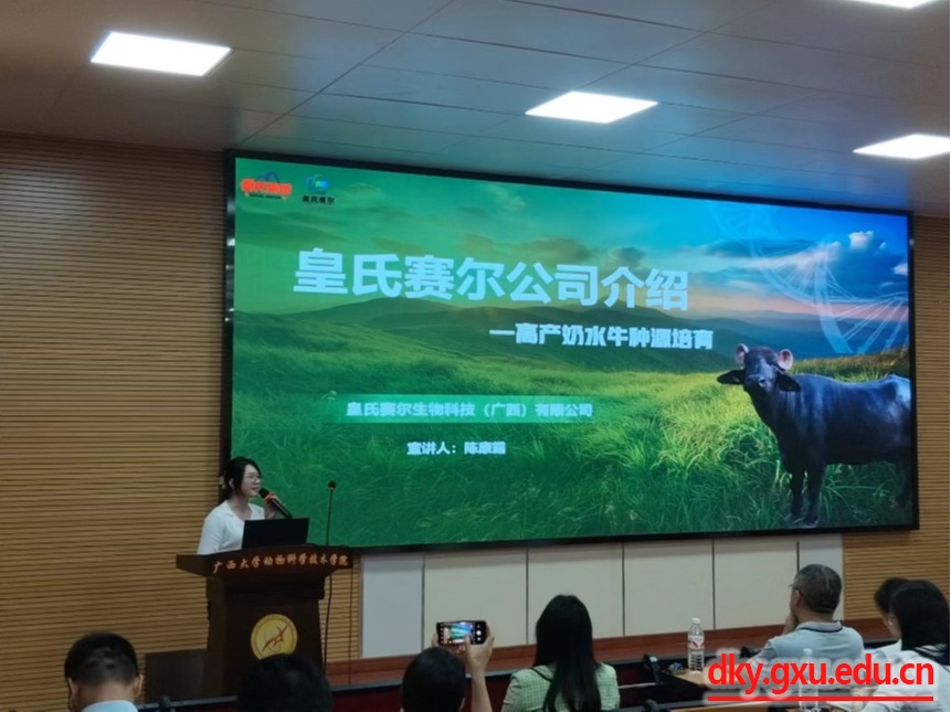 在會議中,皇氏畜牧公司蔣吉燕女士詳細介紹了企業(yè)文化、休假管理、員工成長等方面內(nèi)容;河池雪花牛公司覃潘先生介紹了企業(yè)發(fā)展概況、產(chǎn)業(yè)規(guī)模、發(fā)展計劃等內(nèi)容;皇氏賽爾公司陳康露女士對公司發(fā)展,奶水牛項目進展,員工福利等內(nèi)容進行了匯報;西江金光公司韋英將先生主要匯報了公司基本情況。丁嘉烽老師簡要總結(jié)了各企業(yè)的發(fā)展情況,再次歡迎各實習企業(yè)的到來。師銘咸老師對實習要求給予了細致講解,使同學們充分了解本次生產(chǎn)實習的紀律要求、安全保障、成績考核,以及特殊情況處理等。會議最后,同學們與指導老師和實習單位進行了熱烈的討論。最后由副院長韋祖樟教授作會議總結(jié)發(fā)言。