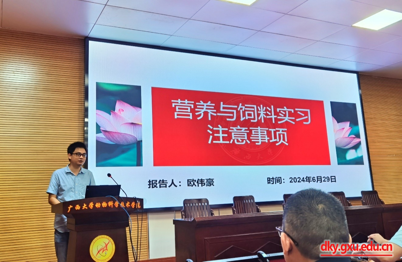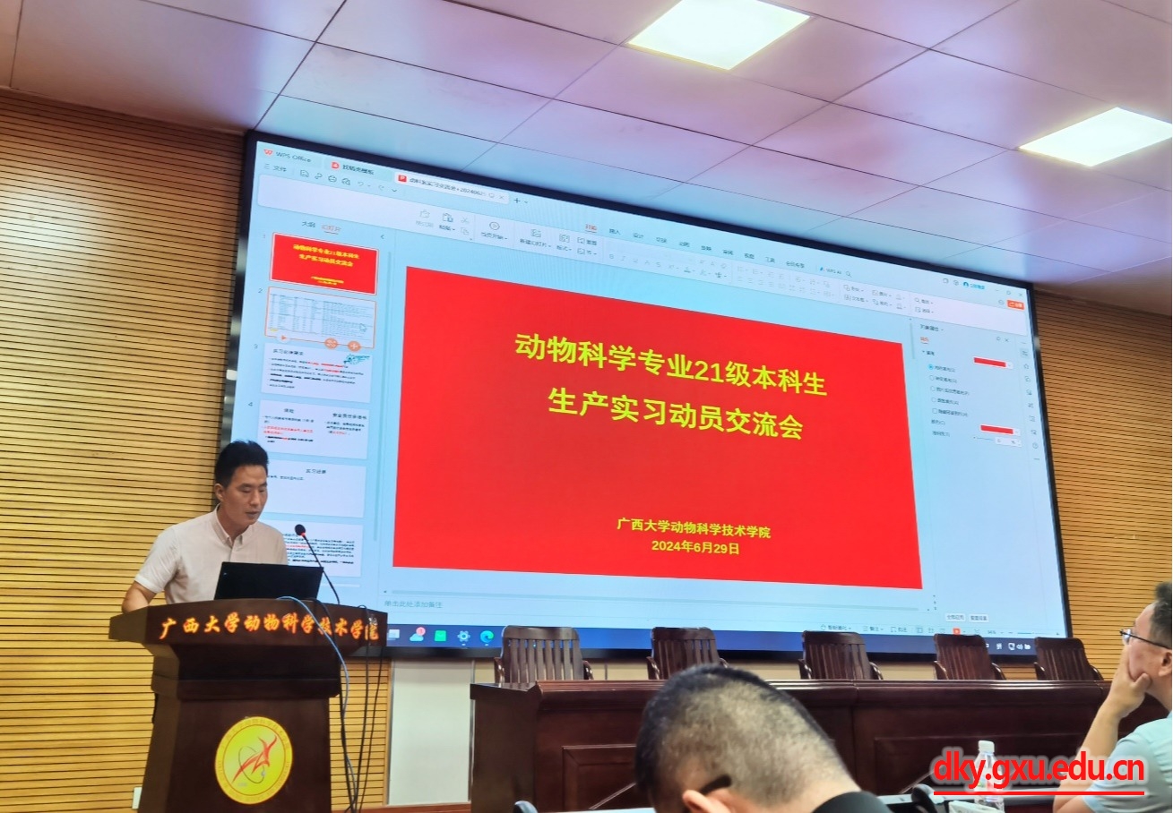 為扎實(shí)推進(jìn)動科專業(yè)學(xué)生實(shí)習(xí)和就業(yè),6月29日上午,動物科學(xué)技術(shù)學(xué)院在學(xué)院318會議室舉辦了2021級動物科學(xué)專業(yè)本科生生產(chǎn)實(shí)習(xí)動員交流會。學(xué)院院長陸陽清教授,副院長蔣欽楊研究員,動科系主任李輝副教授,副主任黃潔萍副教授,實(shí)習(xí)指導(dǎo)老師梁興偉教授、林波副教授、羅棟副教授、孔志偉老師、歐偉豪老師、吳昱果老師、莊站偉老師等,金光畜牧有限公司副總經(jīng)理馬嘯宇、牧原集團(tuán)股份有限公司(廣西)人力資源部經(jīng)理李同坤、廣西新天地農(nóng)牧集團(tuán)有限公司人力資源部經(jīng)理謝小蘭、廣西石埠乳業(yè)有限責(zé)任公司生態(tài)觀光牧場運(yùn)營主管張男吉等,以及2021級動物科學(xué)專業(yè)全體本科生參加了本次會議。