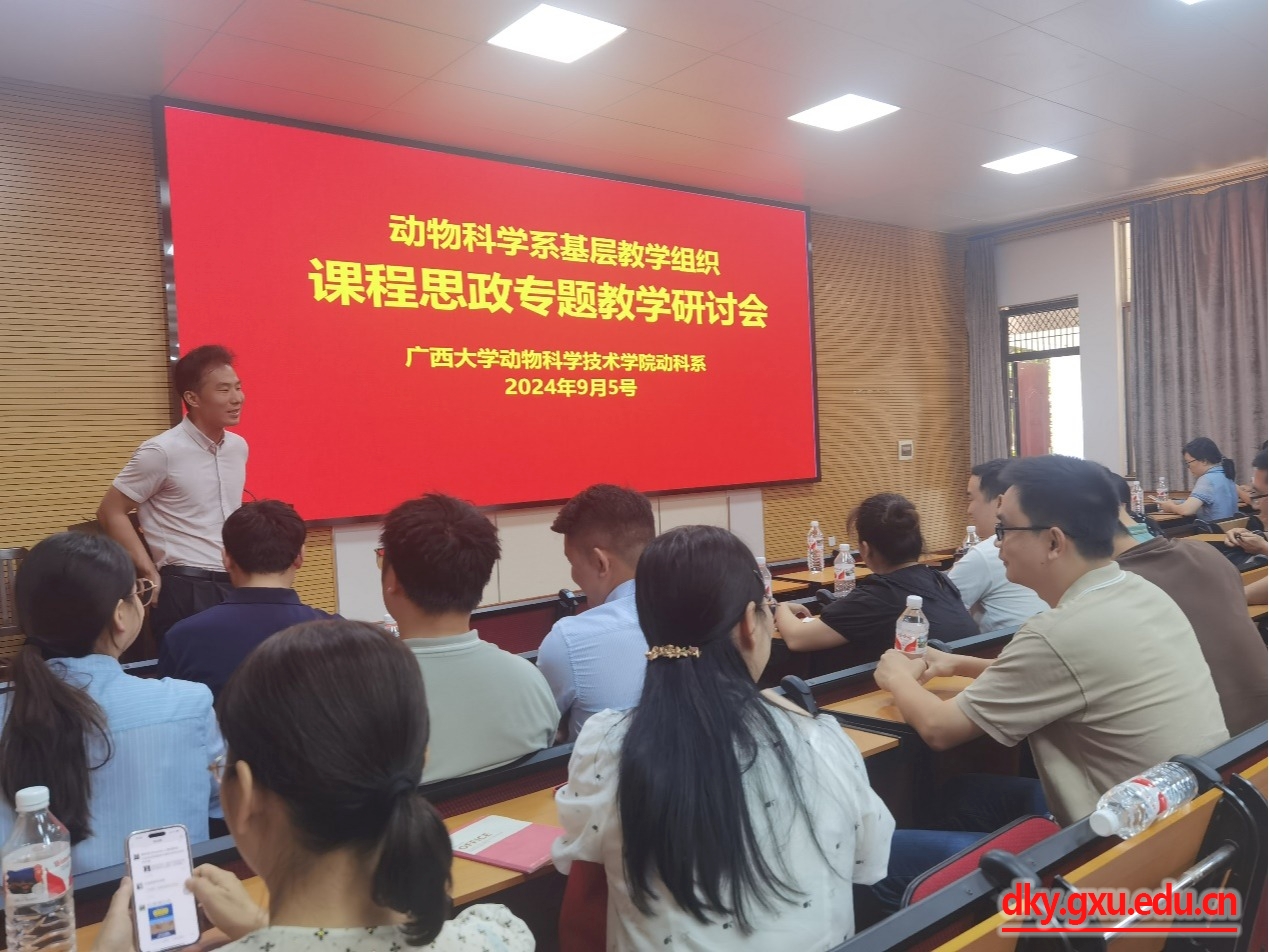 為貫徹落實立德樹人根本任務,推進教育數字化發(fā)展,深化本科教育教學改革,實現本科教育內涵式發(fā)展,提高人才培養(yǎng)質量。根據教育部《關于加快建設高水平本科教育全面提高人才培養(yǎng)能力的意見》(教高〔2018〕2號)、《關于深化本科教育教學改革全面提高人才培養(yǎng)質量的意見》(教高〔2019〕6號)和《廣西大學本科專業(yè)人才培養(yǎng)方案管理辦法(2023年修訂)》(西大教〔2023〕32號)精神,結合我院實際,9月5日下午,我院在學院318會議室舉辦了2025版動科專業(yè)人才培養(yǎng)方案討論會暨課程思政專題教學研討會。動物科學系主任李輝副教授、副主任麻艷群副教授、宋子儀副教授、黃潔萍副教授及全體動科系專任教師參加了本次會議。