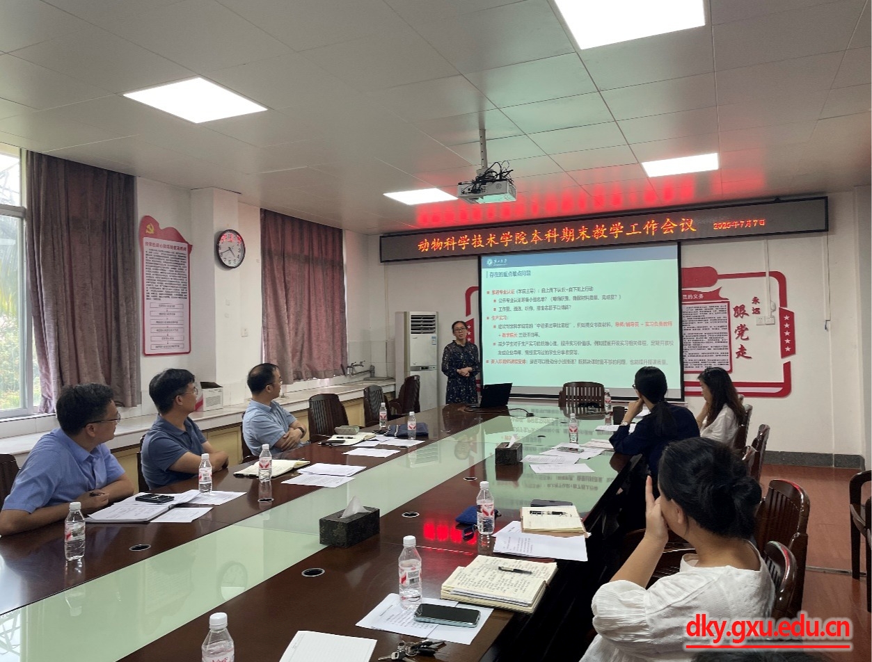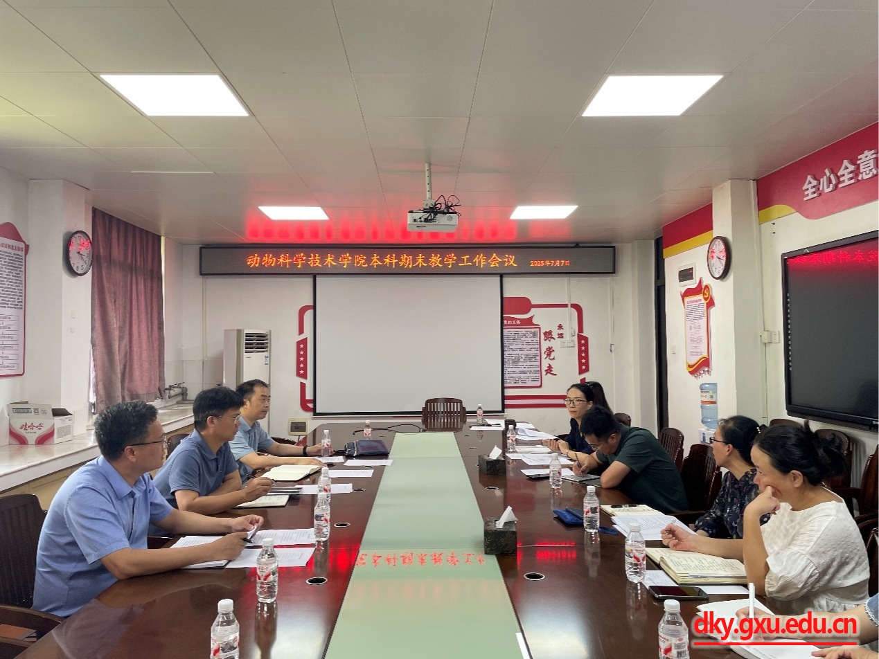 7月7日下午,廣西大學動物科學技術(shù)學院2025年春季學期期末教學工作會議在院302會議室順利召開。動物科學技術(shù)學院黨委書記韋小強,院長陸陽清,副院長蔣欽楊,各基層教學組織負責人、學工組、教學辦工作人員等參會。會議由蔣欽楊副院長主持,圍繞本科教學核心工作展開深入研討與部署。