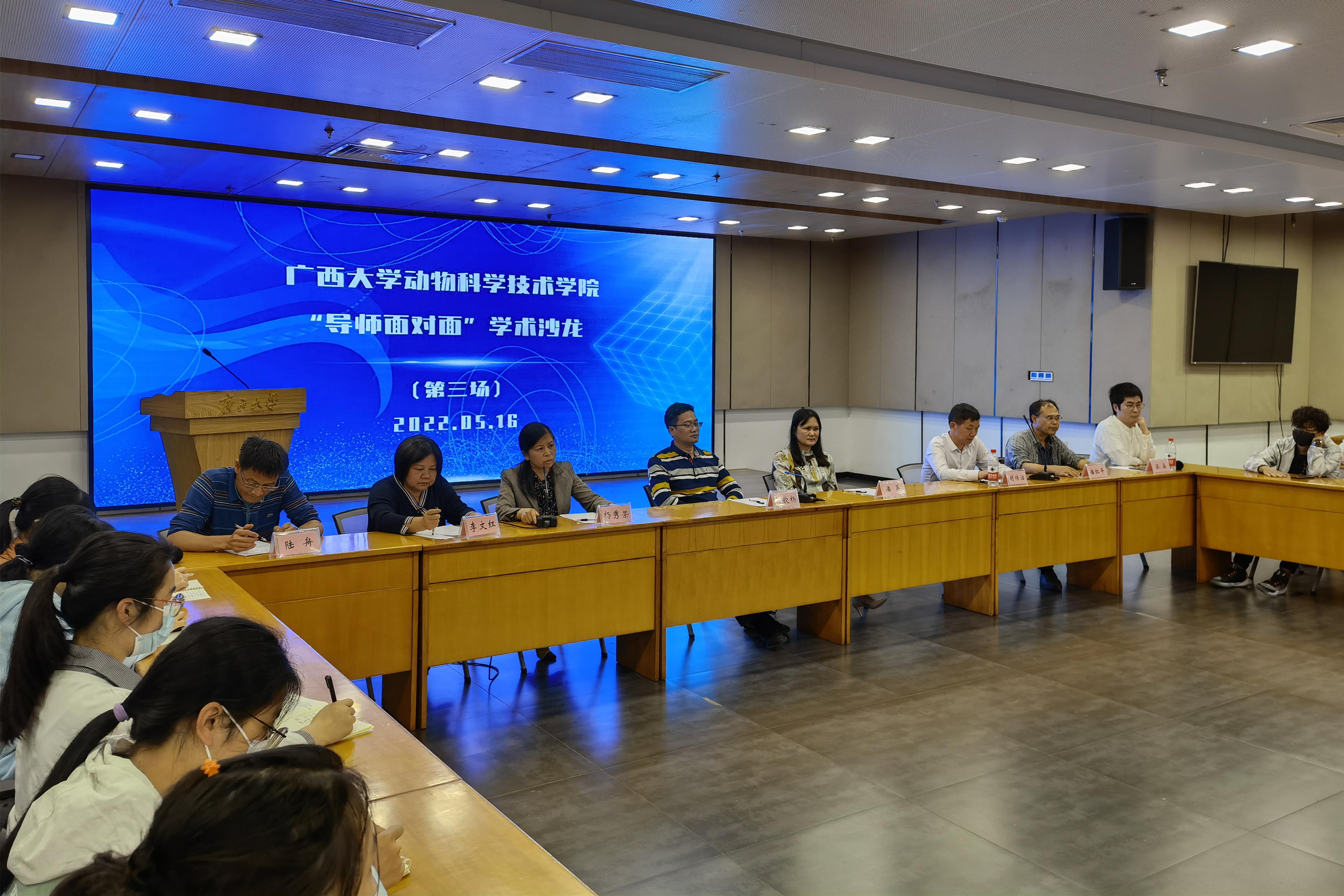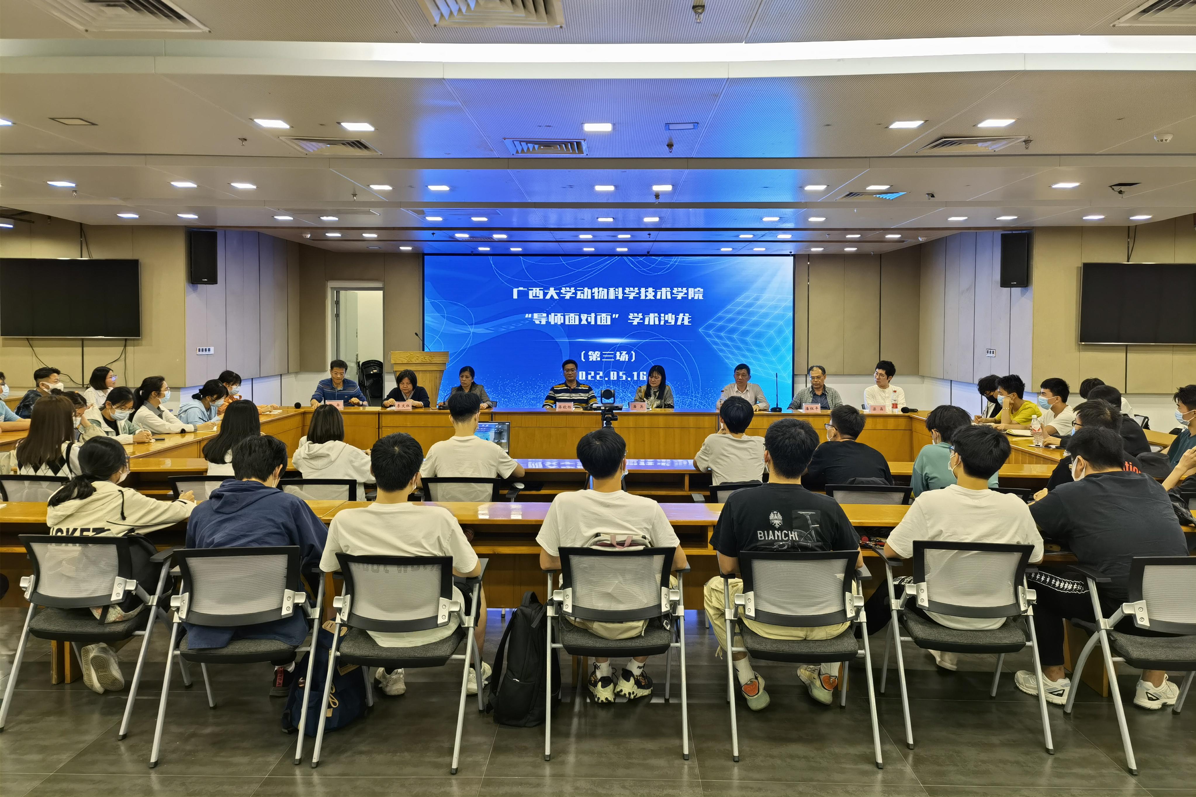 為鞏固專業(yè)思想,加強(qiáng)學(xué)風(fēng)建設(shè),增進(jìn)師生交流,營(yíng)造學(xué)術(shù)氛圍,5月16日晚上,廣西大學(xué)動(dòng)物科學(xué)技術(shù)學(xué)院在大學(xué)生活動(dòng)中心三樓會(huì)議室舉辦“導(dǎo)師面對(duì)面”學(xué)術(shù)沙龍(第三場(chǎng)),邀請(qǐng)蔣欽楊、潘英、楊秀榮、胡傳活、李文紅、潘紅平、陸舟、梁晶8位導(dǎo)師嘉賓到場(chǎng)分享個(gè)人經(jīng)歷、人才培養(yǎng)和科研方向,并與學(xué)生互動(dòng)交流,共同探討學(xué)業(yè)規(guī)劃、職業(yè)發(fā)展和個(gè)人成長(zhǎng)。此次學(xué)術(shù)沙龍采用現(xiàn)場(chǎng)會(huì)議、網(wǎng)絡(luò)直播相結(jié)合的形式,共有80余名學(xué)生參與其中。
