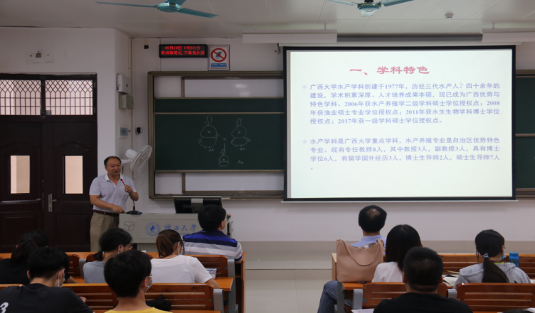 其次,水產(chǎn)學(xué)科黃凱、韋友傳老師以自身的研究方向?yàn)榛A(chǔ),向同學(xué)們介紹了水產(chǎn)學(xué)科的特點(diǎn)和科研成果,激發(fā)了同學(xué)們對本校水產(chǎn)學(xué)科的研究興趣;同時(shí),老師們展示了自己與優(yōu)秀畢業(yè)生的生活經(jīng)歷,進(jìn)一步加深了學(xué)生對研究生生活的向往,增強(qiáng)了考研自信心。此外,老師們還介紹了專業(yè)發(fā)展前景和就業(yè)信息,消除了同學(xué)們的就業(yè)疑慮,激發(fā)了同學(xué)們的報(bào)考熱情。