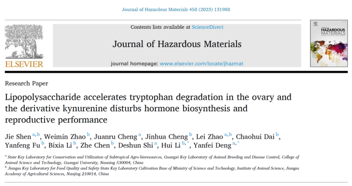 2023年7月,我院石德順研究員團(tuán)隊(duì)鄧彥飛副教授在國(guó)際Top期刊《Journal of Hazardous Materials》(中科院一區(qū),Top 2%,IF=13.6)在線發(fā)表了題為“Lipopolysaccharide accelerates tryptophan degradation in the ovary and the derivative kynurenine disturbs hormone biosynthesis and reproductive performance”的研究成果,首次報(bào)道了環(huán)境中細(xì)菌內(nèi)毒素(脂多糖/LPS)引發(fā)卵泡顆粒細(xì)胞色氨酸/犬尿氨酸代謝異常(犬尿氨酸堆積)影響動(dòng)物卵巢功能和繁殖性能的新機(jī)制。內(nèi)毒素是革蘭氏陰性菌細(xì)胞壁的主要組成成分,以脂多糖(Lipopolysaccharide, LPS) 為主要代表。在細(xì)菌死亡和裂解時(shí),LPS被釋放到周圍環(huán)境中。由于其化學(xué)和熱穩(wěn)定性較強(qiáng),LPS可以在多種環(huán)境條件下長(zhǎng)期存在。隨著畜牧業(yè)養(yǎng)殖規(guī)模增加和養(yǎng)殖密度提高,因飼養(yǎng)管理不善常常造成動(dòng)物所處的生活環(huán)境較惡劣,因而更容易受到細(xì)菌和LPS的感染。現(xiàn)有研究表明,動(dòng)物感染LPS時(shí),LPS可通過(guò)血液循環(huán)進(jìn)入卵泡液并作用于卵泡顆粒細(xì)胞而影響其功能,如導(dǎo)致激素分泌失衡、卵巢功能衰竭等,最終引起繁殖性能降低,但其潛在機(jī)制尚不清楚。該研究發(fā)現(xiàn),LPS作用于豬卵泡顆粒細(xì)胞時(shí)可通過(guò)p38, NF-κB和JNK信號(hào)通路增強(qiáng)色氨酸代謝的關(guān)鍵酶Ido1的表達(dá),從而引起色氨酸代謝加速,造成其衍生物犬尿氨酸堆積,進(jìn)而抑制Cyp19a1和Fshr的表達(dá),減少雌激素合成,最終影響豬卵泡顆粒細(xì)胞的功能。進(jìn)一步的小鼠模型研究結(jié)果也表明,LPS誘導(dǎo)小鼠卵巢中Ido1高表達(dá),并引發(fā)血液中犬尿氨酸水平升高。通過(guò)直接給小鼠腹腔注射犬尿氨酸可發(fā)現(xiàn)激素分泌失衡,并顯著抑制了排卵和黃體形成,最終降低了繁殖性能(受胎率和活仔率降低)。該研究闡明了LPS感染通過(guò)誘導(dǎo)色氨酸代謝紊亂影響動(dòng)物卵巢功能和繁殖性能的機(jī)制,首次發(fā)現(xiàn)色氨酸-犬尿氨酸代謝紊亂(犬尿氨酸堆積)破壞卵巢功能、降低動(dòng)物繁殖性能。該研究為提高家畜繁殖效率乃至治療人類卵巢功能障礙引起的不孕提供了新的見(jiàn)解。