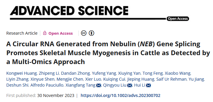 近日,廣西大學(xué)動(dòng)物科學(xué)技術(shù)學(xué)院石德順教授帶領(lǐng)的動(dòng)物克隆與生殖調(diào)控研究團(tuán)隊(duì)聯(lián)合佛山科學(xué)技術(shù)學(xué)院、中國(guó)農(nóng)業(yè)科學(xué)院和西北農(nóng)林科技大學(xué)等單位在牛肉用性狀功能基因組解析方面取得重要研究進(jìn)展,研究成果以A circular RNA generated from Nebulin (NEB) gene splicing promotes skeletal muscle myogenesis in cattle as detected by a multi-omics approach為題發(fā)表于國(guó)際知名期刊《AdvancedScience》。廣西大學(xué)為該論文的第一完成單位,博士畢業(yè)生黃孔威、助理教授李志鵬和博士研究生鐘丹丹為共同第一作者,李輝副教授、佛山科學(xué)技術(shù)學(xué)院劉慶友教授和中國(guó)農(nóng)業(yè)科學(xué)院唐湘方研究員為共同通訊作者。原文鏈接:https://onlinelibrary-wiley-com-s.vpn.gxu.edu.cn:8118/doi/10.1002/advs.202300702。