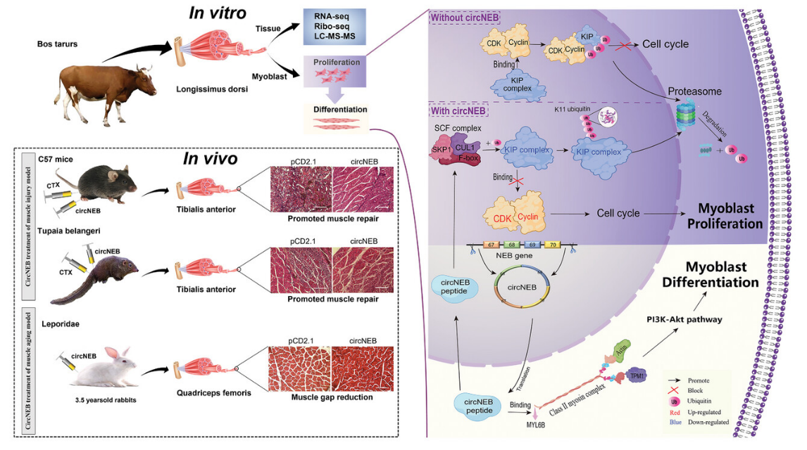 該研究整合牛RNA-seq、Ribo-seq和小肽組等多組學(xué)數(shù)據(jù),構(gòu)建了首個(gè)家畜非編碼RNA編碼圖譜,結(jié)合功能研究發(fā)現(xiàn),非編碼RNAcircNEB可以編碼一個(gè)含907個(gè)氨基酸的肌肉特異性肽,在體外可促進(jìn)成肌細(xì)胞的增殖和分化,在體內(nèi)可誘導(dǎo)肌肉再生。