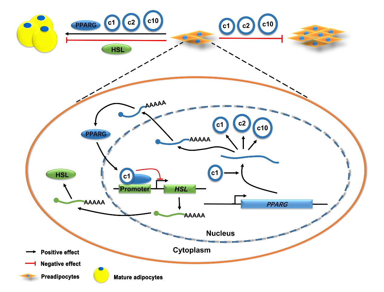 改善水牛的肌內(nèi)脂肪沉積,將進(jìn)一步提升水牛肉用性能,緩解我國牛肉供應(yīng)壓力。脂肪生成受眾多轉(zhuǎn)錄因子調(diào)控,其中PPARG處于核心地位,對脂肪生成必不可少。該研究前期通過RNA-seq發(fā)現(xiàn)3個過氧化物酶體增殖劑激活受體γ(PPARG)來源的外顯子型的circRNAs(circPPARGAs)在脂肪組織、成熟脂肪細(xì)胞和育肥水牛的背最長肌中高表達(dá),提示circPPARGs可能在肌內(nèi)脂肪生成中扮演重要角色。circPPARGs在水牛、黃牛、小鼠等物種中展現(xiàn)出較高的保守性。在細(xì)胞水平上,circPPARGs增強(qiáng)水牛、黃牛、小鼠肌內(nèi)脂肪細(xì)胞的成脂分化,并抑制細(xì)胞增殖;在活體水平上,circPPARG1可促進(jìn)小鼠肌內(nèi)脂肪沉積;在機(jī)制上,表達(dá)豐度最高的circPPARG1通過PPARG與HSL增強(qiáng)肌內(nèi)脂肪沉積。該研究揭示了PPARG來源的外顯子型circRNAs在水牛、黃牛和小鼠上功能保守,并通過調(diào)控PPARG與HSL增強(qiáng)肌內(nèi)脂肪沉積。該研究進(jìn)一步完善了脂肪生成的網(wǎng)絡(luò)圖,并為改善水牛肉質(zhì)提供了理論基礎(chǔ)。