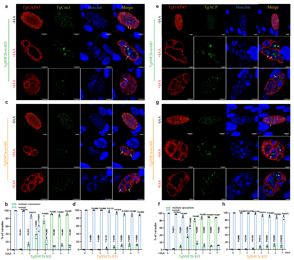 本研究通過“生長素誘導的降解”技術(shù),構(gòu)建了SWI/SNF染色質(zhì)重塑復合體核心亞基的條件性敲低蟲株,探究了該復合體在弓形蟲速殖子階段的功能。研究表明,SWI/SNF復合體是維持寄生蟲正常生長和分裂模式所必需的“激活器”。抑制該復合體功能,會導致寄生蟲分裂模式從有序的“一分為二”變?yōu)楫惓5摹耙环譃槎唷保㈠e誤表達其他發(fā)育階段的基因。弓形蟲SWI/SNF復合體通過維持速殖子特異性基因的染色質(zhì)開放性,并與“抑制器”MORC協(xié)同,實現(xiàn)對基因表達的“雙重門控”,從而精確維持寄生蟲的“身份”。這些發(fā)現(xiàn)闡明了弓形蟲生命周期調(diào)控的關(guān)鍵機制,為開發(fā)新型抗弓形蟲病藥物提供了一種全新、高效的策略,也為寄生蟲表觀遺傳學研究提供了重要的理論依據(jù)。