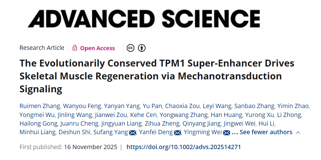 近日,廣西大學(xué)動(dòng)物科學(xué)技術(shù)學(xué)院動(dòng)物生殖調(diào)控與遺傳改良團(tuán)隊(duì)在牛骨骼肌發(fā)育研究領(lǐng)域取得重要進(jìn)展。該研究揭示了表觀遺傳調(diào)控與細(xì)胞機(jī)械力學(xué)如何協(xié)同調(diào)控牛肌肉干細(xì)胞(MuSCs)分化及肌肉發(fā)育的機(jī)制。成果以“The Evolutionarily Conserved TPM1 Super-Enhancer Drives Skeletal Muscle Regeneration via Mechanotransduction Signaling”為題,在線發(fā)表在國際知名期刊《Advanced Science》(IF5-year =15.6)。論文的第一作者為動(dòng)物科學(xué)技術(shù)學(xué)院助理教授張瑞門,通訊作者為農(nóng)發(fā)院教授韋英明、動(dòng)物科學(xué)技術(shù)教授鄧彥飛及楊素芳,廣西大學(xué)為該論文的第一完成單位。