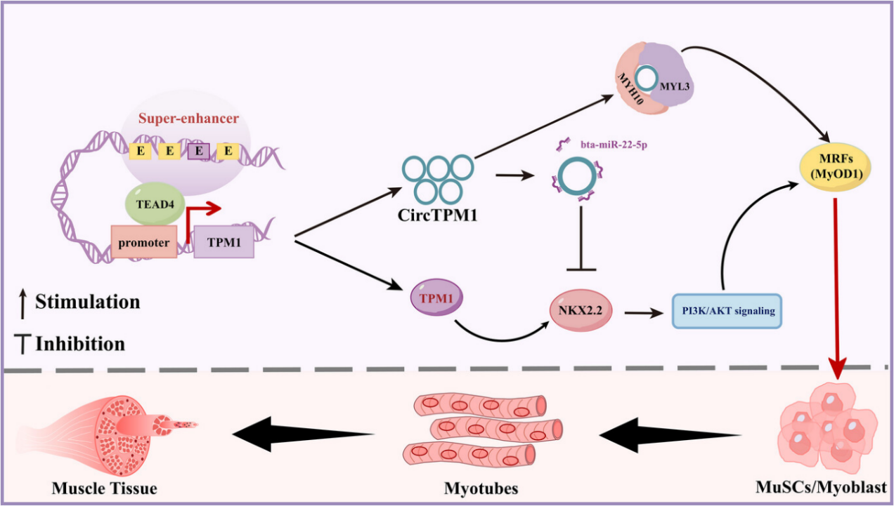 牛肉作為全球公認(rèn)的重要?jiǎng)游锏鞍讈碓矗哂酗@著的經(jīng)濟(jì)價(jià)值,在保障全球糧食安全和消除貧困方面發(fā)揮著關(guān)鍵作用。骨骼肌再生是一個(gè)高度協(xié)調(diào)的過程,依賴于MuSCs的定向分化能力。超級(jí)增強(qiáng)子作為關(guān)鍵的表觀遺傳調(diào)控元件,能夠高效驅(qū)動(dòng)細(xì)胞命運(yùn)決定基因的表達(dá)。本研究通過跨物種(牛、小鼠、人)基因組數(shù)據(jù)分析,首次揭示了TPM1基因超級(jí)增強(qiáng)子(TPM1_SE)在骨骼肌再生中的核心、保守性作用,闡明了其通過整合表觀遺傳調(diào)控與細(xì)胞機(jī)械力學(xué)信號(hào),協(xié)同促進(jìn)肌肉生成的新機(jī)制。該研究不僅深化了對肌肉生成機(jī)制的理解,也為肌肉退行性疾病治療和畜牧業(yè)肉質(zhì)改良提供了新的理論依據(jù)和潛在靶點(diǎn)。