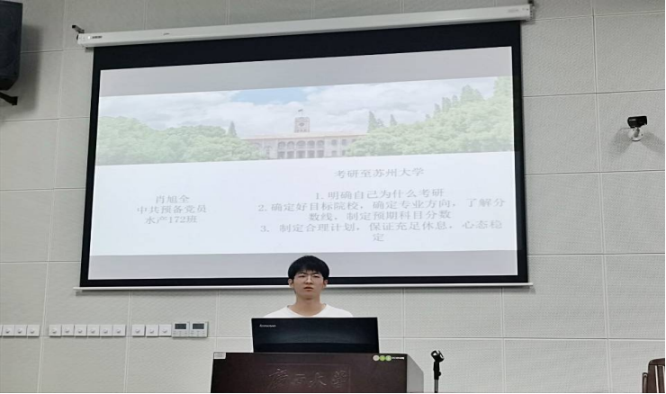 6月2日上午,廣西大學(xué)動(dòng)物科學(xué)技術(shù)學(xué)院本科生水產(chǎn)養(yǎng)殖學(xué)黨支部全體畢業(yè)生黨員在黨支部書記彭可可老師的組織下,深入《心理素質(zhì)與生涯發(fā)展(三)》講堂,與2018級(jí)的動(dòng)科學(xué)子分享其保研、考研的學(xué)習(xí)經(jīng)驗(yàn)和心路歷程,幫助他們更好的了解保研、考研道路上可能遇到的困難和解決方法。