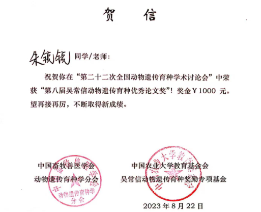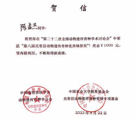 第二十二次全國動物遺傳育種學(xué)術(shù)討論會是我國動物遺傳育種領(lǐng)域進行學(xué)術(shù)交流的一個優(yōu)秀平臺。此次大會以“BT+IT驅(qū)動種業(yè)振興”為主題,匯集了豬遺傳育種、家禽遺傳育種技術(shù)、草食動物遺傳育種技術(shù)、基因組選擇與統(tǒng)計基因組、家禽基因編輯、基因組組裝與功能解析、微生物組與畜禽遺傳育種等方向的最新科研成果。交流方式包括主會場特邀報告、分會場報告以及墻報。我院博士研究生張叁保(導(dǎo)師:蔣欽楊)、陳孟杰(導(dǎo)師:石德順、李輝)、陳亞玲(導(dǎo)師:李湘萍、李輝)、朱銳銳(導(dǎo)師:黃潔萍)分別做了口頭匯報和墻報,其中,張叁保和朱銳銳口頭匯報榮獲優(yōu)秀論文獎,陳孟杰榮獲青年學(xué)者旅行獎和優(yōu)秀墻報獎。通過參加本次學(xué)術(shù)討論會,大家學(xué)習(xí)了動物遺傳育種學(xué)領(lǐng)域的最新科研成果、研究動態(tài)與趨勢,這有助于梳理和擴展研究思路,更好地規(guī)劃未來的研究方向。