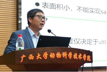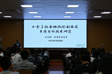 報告伊始,王戰(zhàn)輝教授先介紹了中國農(nóng)業(yè)大學(xué)獸醫(yī)學(xué)系的概況和研究內(nèi)容,并側(cè)重介紹了其在快速檢測方面的研究進展。隨后,王戰(zhàn)輝教授講述了小分子化合物快速檢測的背景、研究意義和目前存在的問題,并提出了“抗體是小分子化合物快檢性能的決定性因素”。隨后,王戰(zhàn)輝教授就如何提升快速檢測性能,從“半抗原理性設(shè)計合成”、“單克隆抗體發(fā)現(xiàn)及進化”、“免疫檢測新技術(shù)及產(chǎn)品開發(fā)”、“抗體分子識別機制的研究”四個方面,深入淺出地向與會師生們介紹了相關(guān)領(lǐng)域內(nèi)前沿技術(shù)的研究進展、技術(shù)難點、未來研究方向等。讓師生們對小分子化合物快速檢測領(lǐng)域有了更深入的了解,開拓了同學(xué)們的學(xué)術(shù)視野,增強了同學(xué)們的學(xué)術(shù)素養(yǎng)。