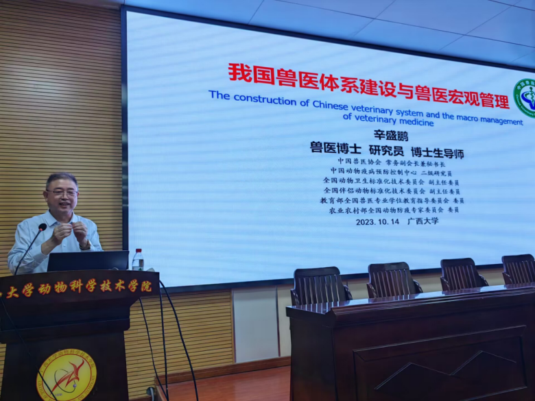 2023年10月14日上午,在廣西大學動物科學技術(shù)學院318報告廳,中國動物疫病預防控制中心原副主任、中國獸醫(yī)協(xié)會副會長兼秘書長辛盛鵬研究員應邀為廣大師生做了一場主題為“我國獸醫(yī)體系建設(shè)與獸醫(yī)宏觀管理”的報告。廣西大學副校長羅廷榮教授主持報告會,會場近300個座位座無虛席。