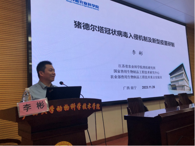 2023年11月26日下午16點,江蘇省農業(yè)科學院獸醫(yī)研究所所長李彬研究員應邀到廣西大學動物科學技術學院作題為“豬德爾塔冠狀病毒入侵機制及新型疫苗研制”的學術報告,與學院老師就國家自然科學基金項目的申報要點進行了交流座談。動物科學技術學院副院長韋祖樟教授主持報告會和座談會,近100名師生參加了報告會。