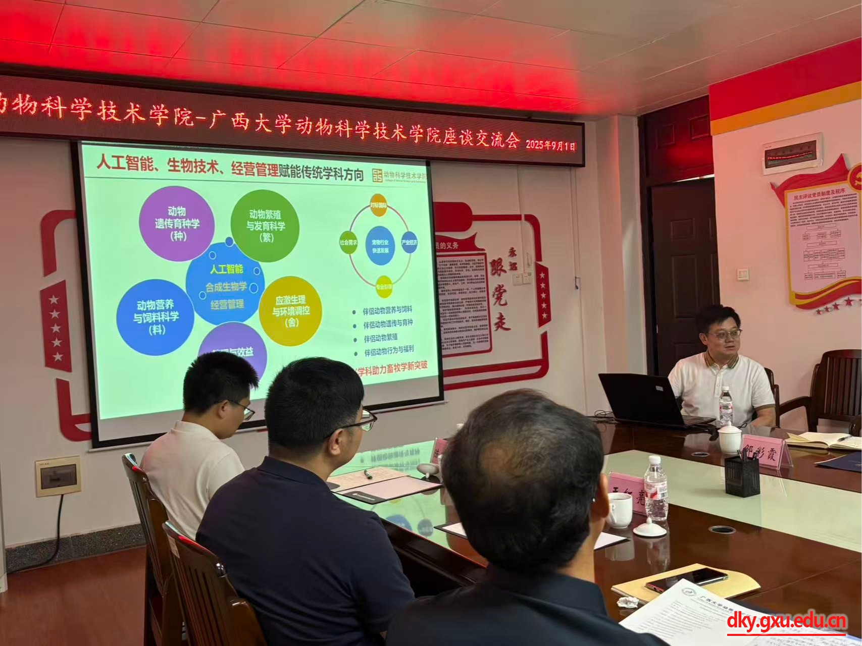 9月1日下午,調(diào)研交流會(huì)在廣西大學(xué)動(dòng)物科學(xué)技術(shù)學(xué)院302會(huì)議室舉行。陸陽(yáng)清教授致歡迎辭,并從辦學(xué)歷史、辦學(xué)規(guī)模、師資隊(duì)伍、專(zhuān)業(yè)設(shè)置、科研成果及教學(xué)特色等方面系統(tǒng)介紹了學(xué)院總體情況。同時(shí)還圍繞“‘十五五’發(fā)展/平臺(tái)謀劃”等內(nèi)容進(jìn)行分享,與來(lái)賓深入交流研討。