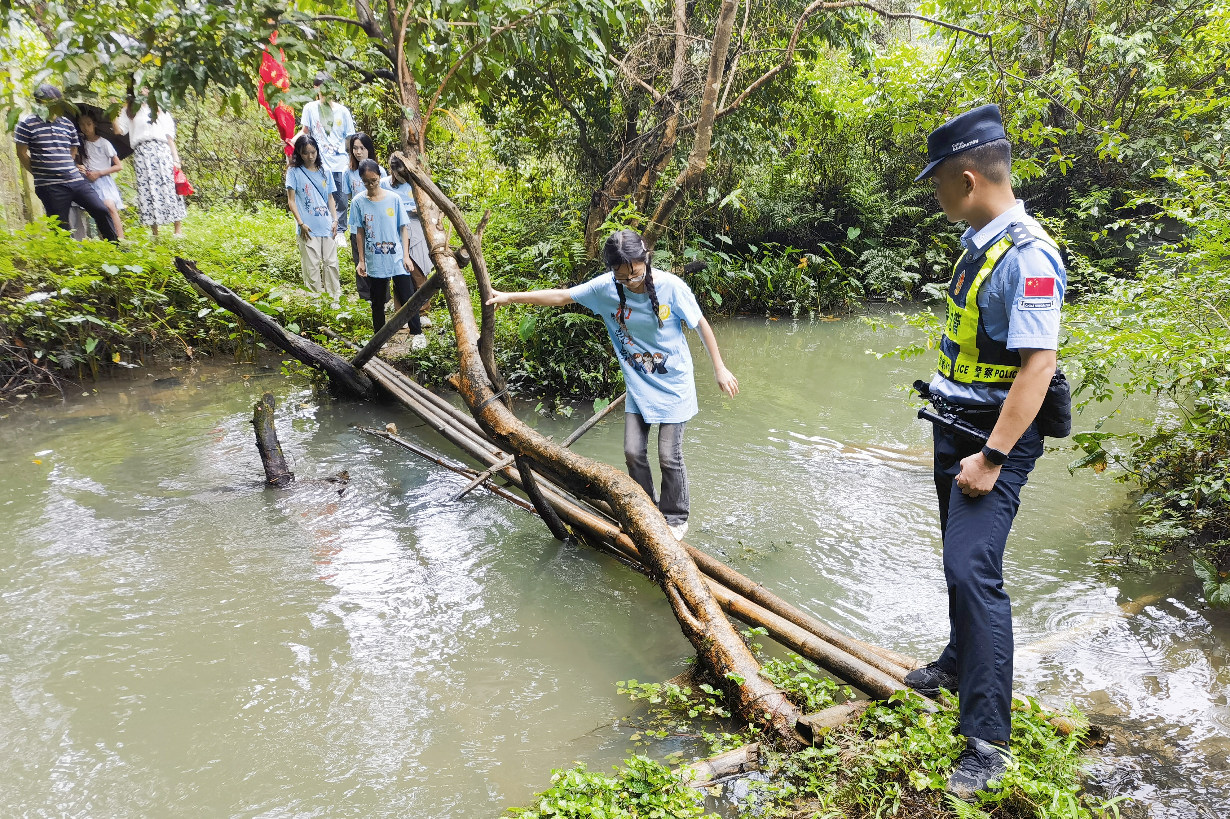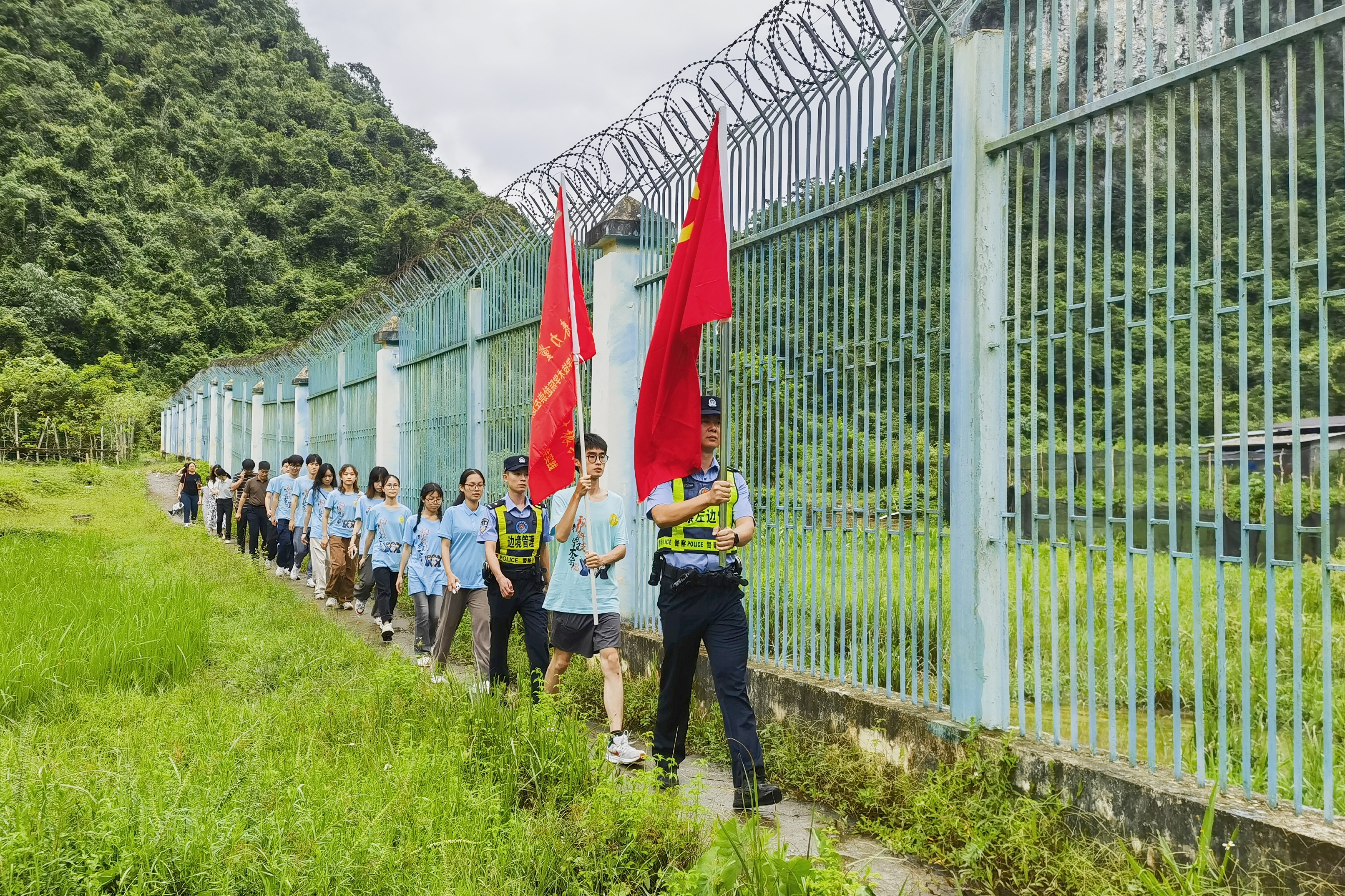 We will organically integrate ethnic unity and progress with border social governance, mobilize village cadres, grid workers, and volunteers to form a 'village protection team', and achieve the joint creation of a safe border by the police and the people, "said a police officer from Jinlong Border Police Station. In the drizzling rain, the teachers and students of the practice group lined up neatly, followed the police to conduct a border patrol experience, and painted the 879 boundary marker red, listening to the story of guarding and strengthening the border while promoting it.
